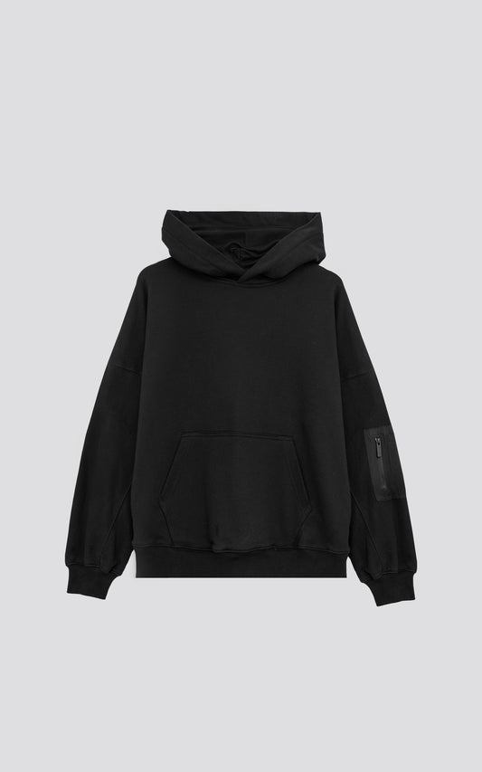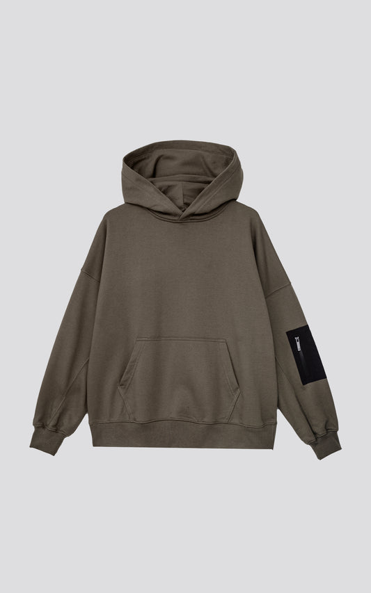 Hoodie confeccionado en rústico 100% algodón, silueta oversize. Bolsillo de microfibra en manga estilo bomber...