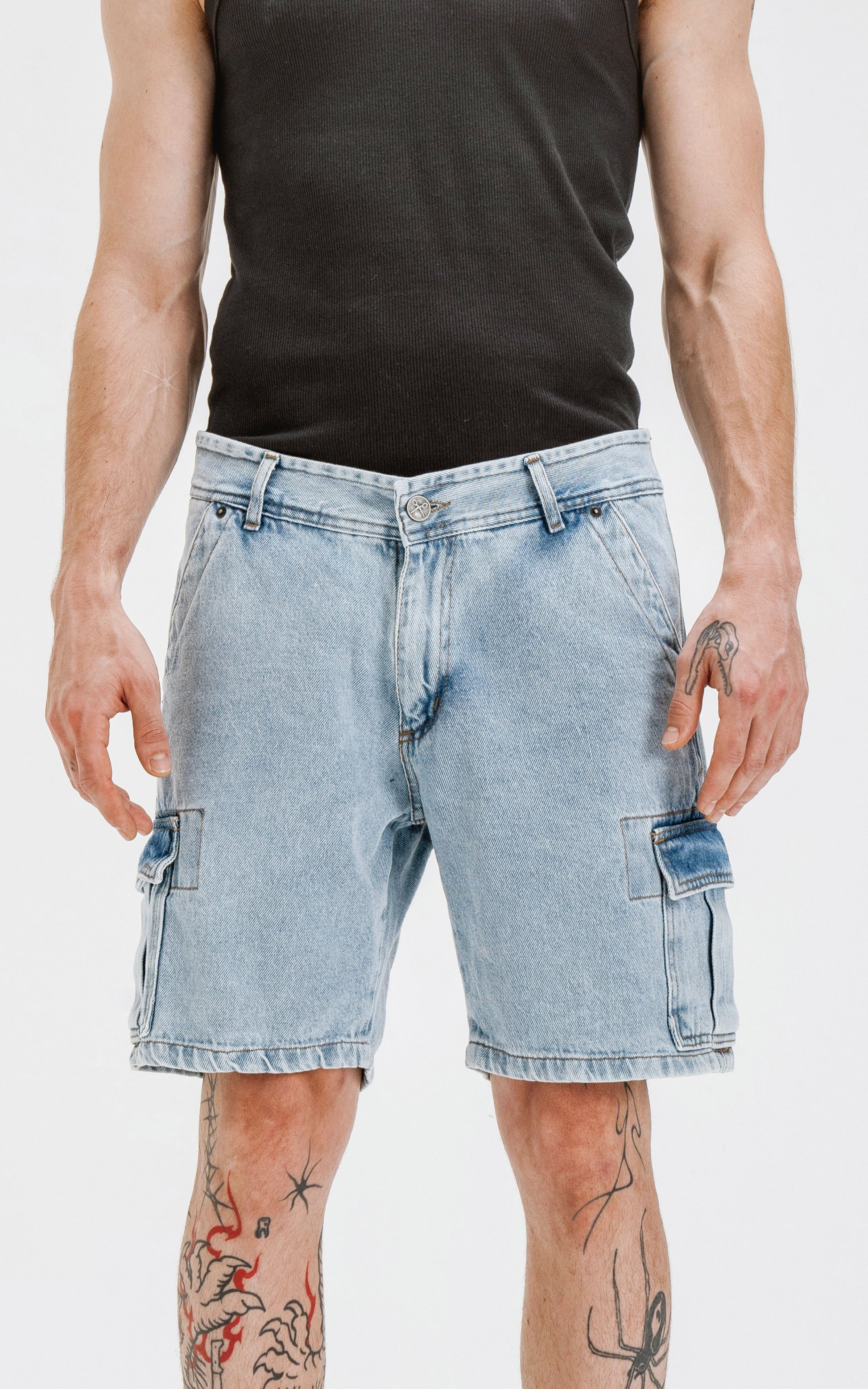 Bermuda cargo de jean, cintura con braqueta y botón metalico LUXO, posee calce regular y dos bolsillos laterales / delanteros.