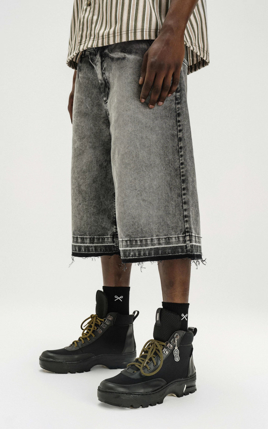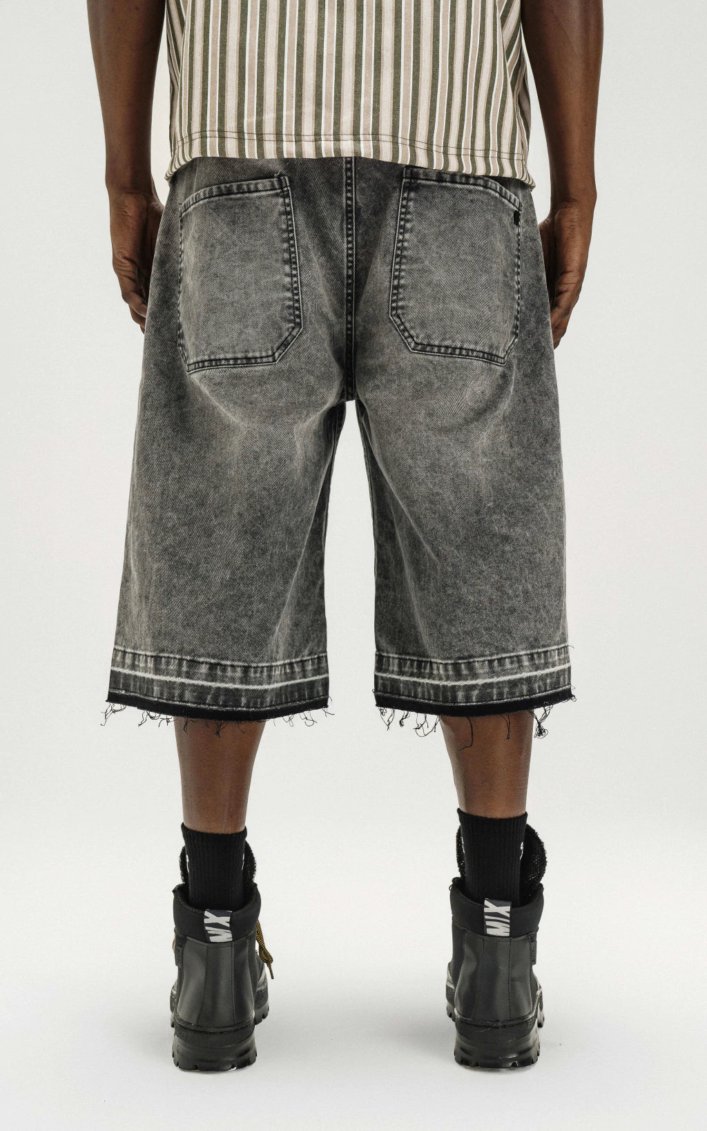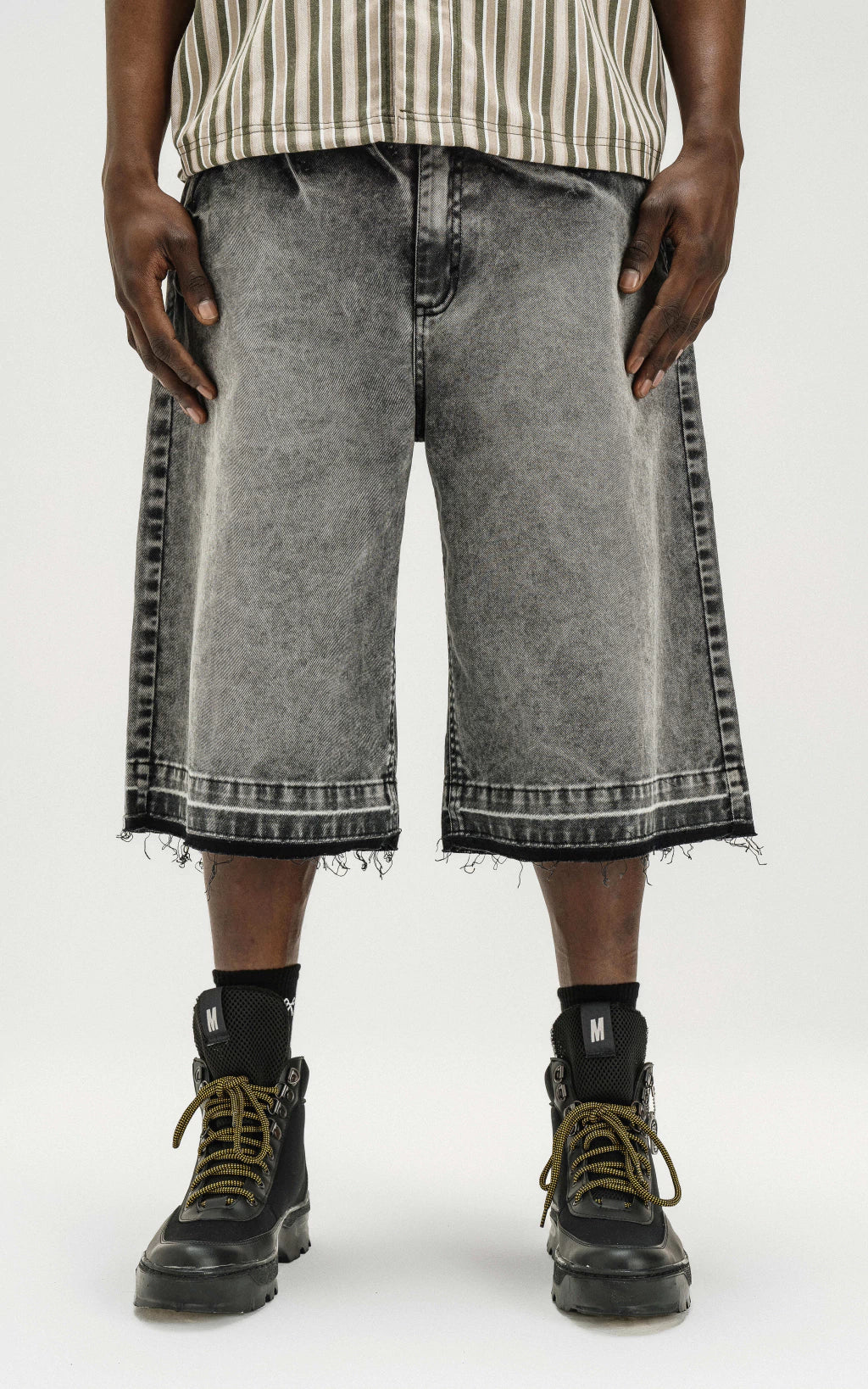 Bermuda denim larga, calce oversize con desgaste y detalle en el ruedo de efecto desflecado.