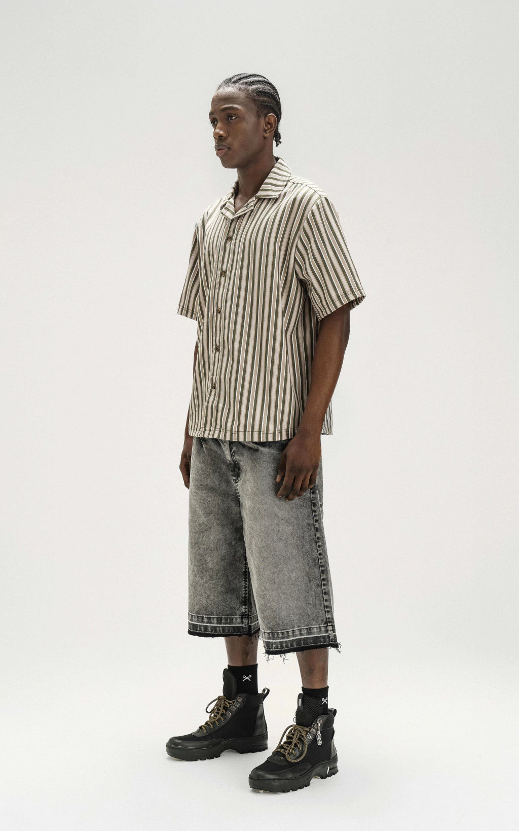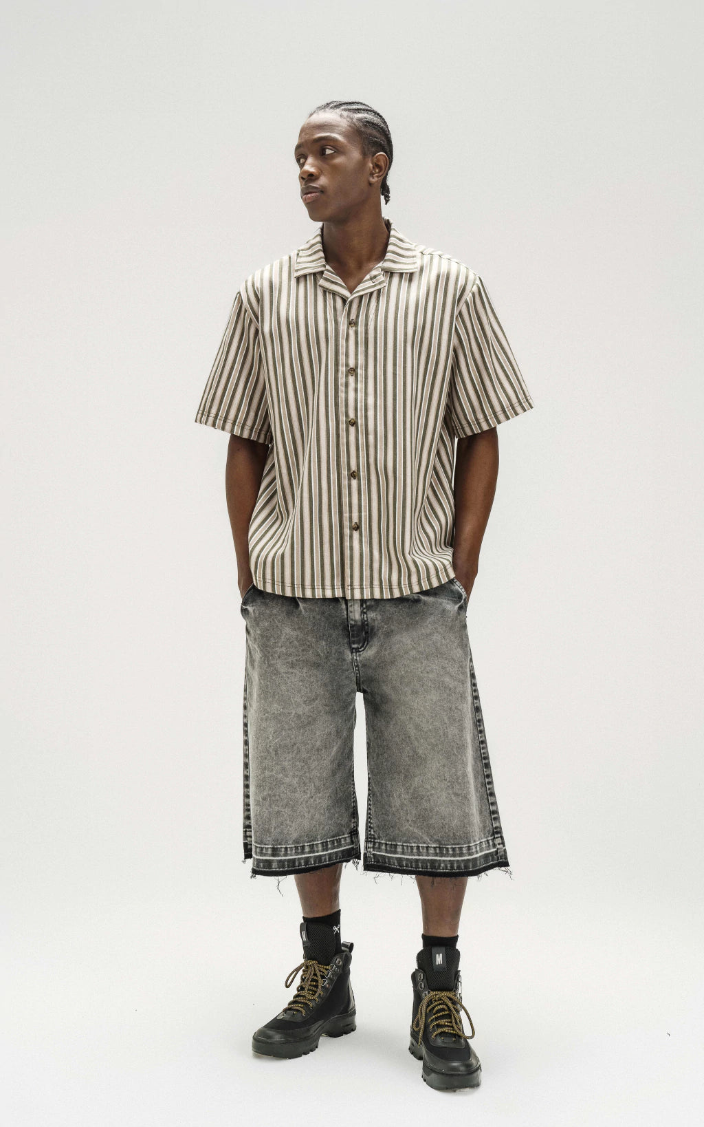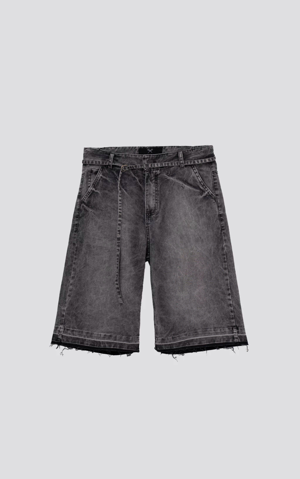 Bermuda denim larga, calce oversize con desgaste y detalle en el ruedo de efecto desflecado.