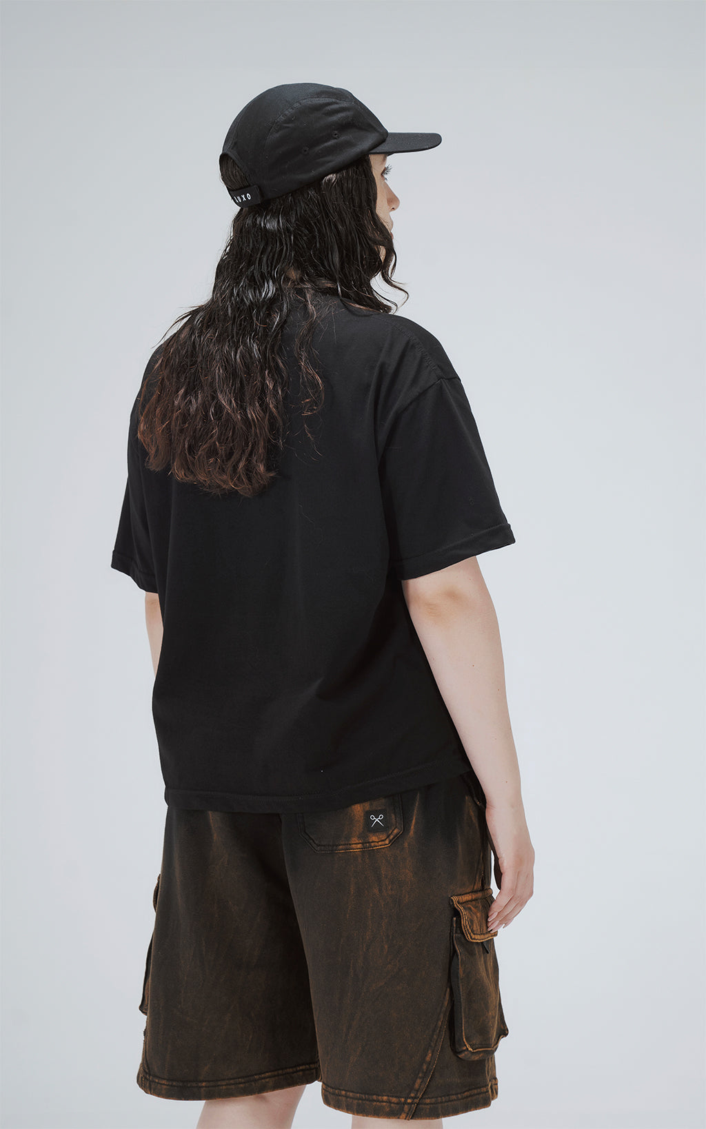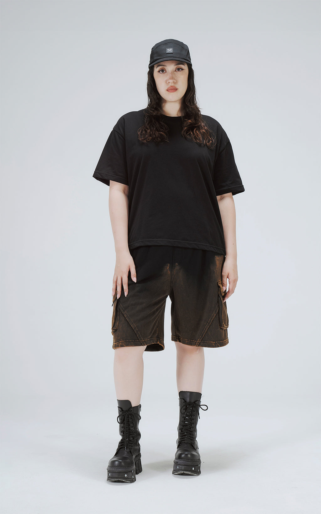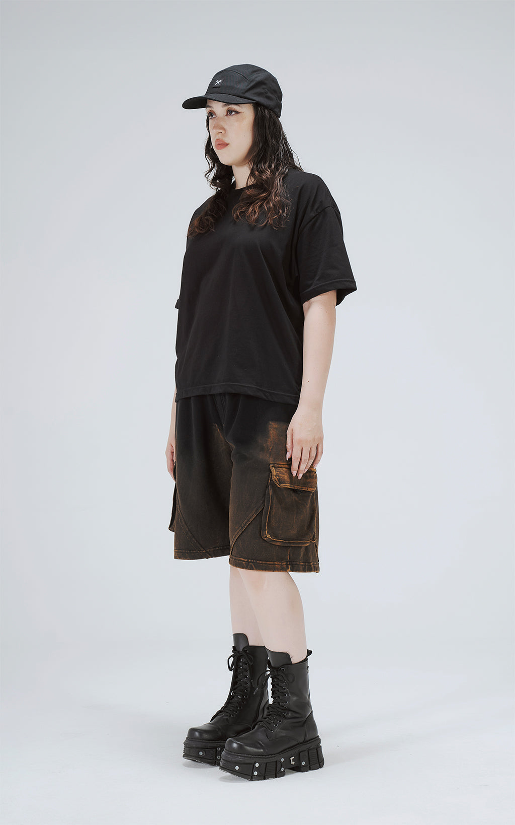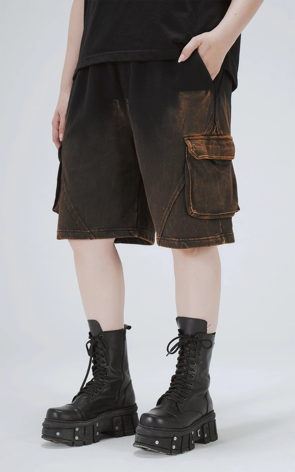 Bermuda estilo cargo con recortes, bolsillos laterales y bolsillos con tapa de calce oversize confeccionada en rústico 100% algodón con proceso de desgaste.