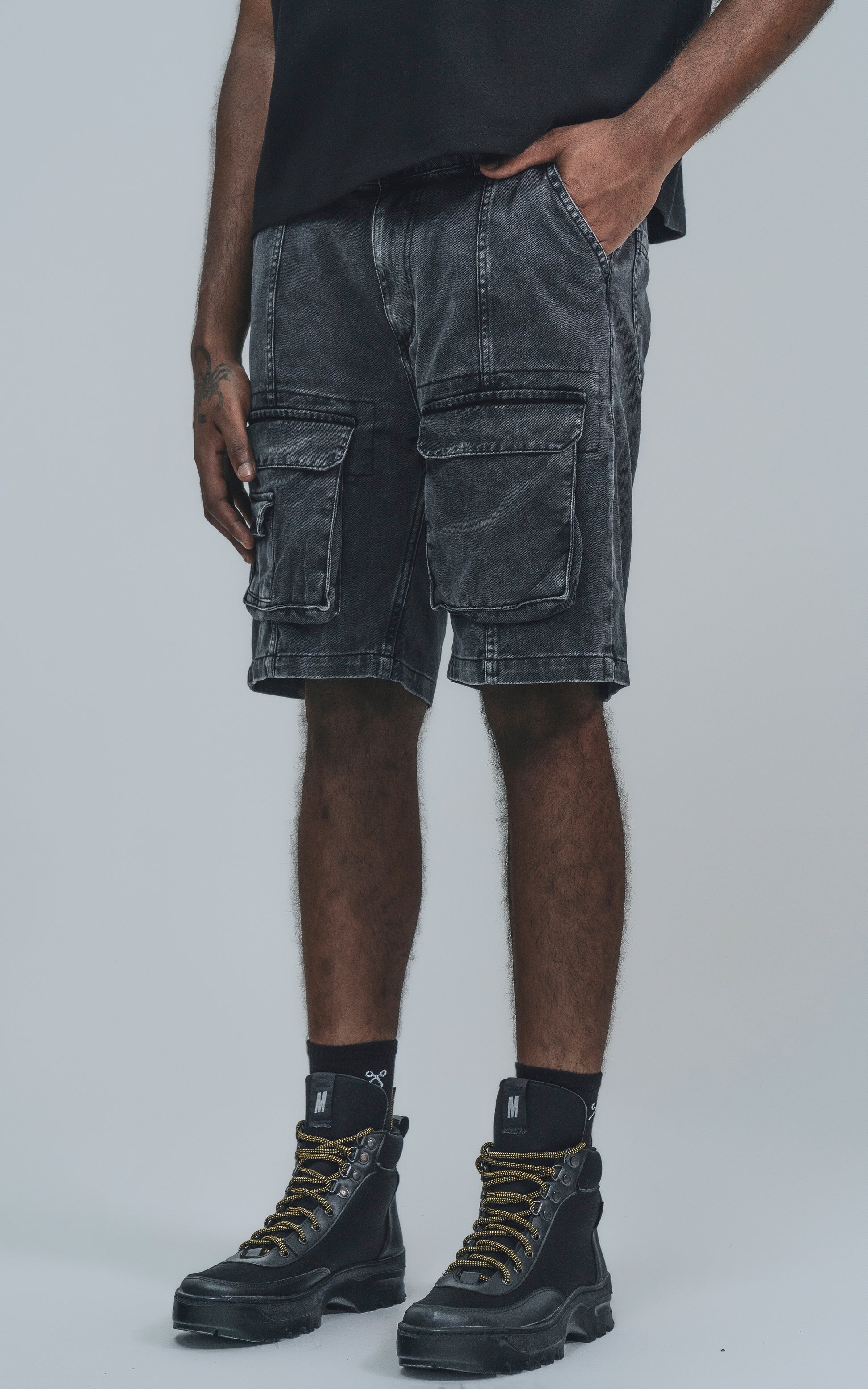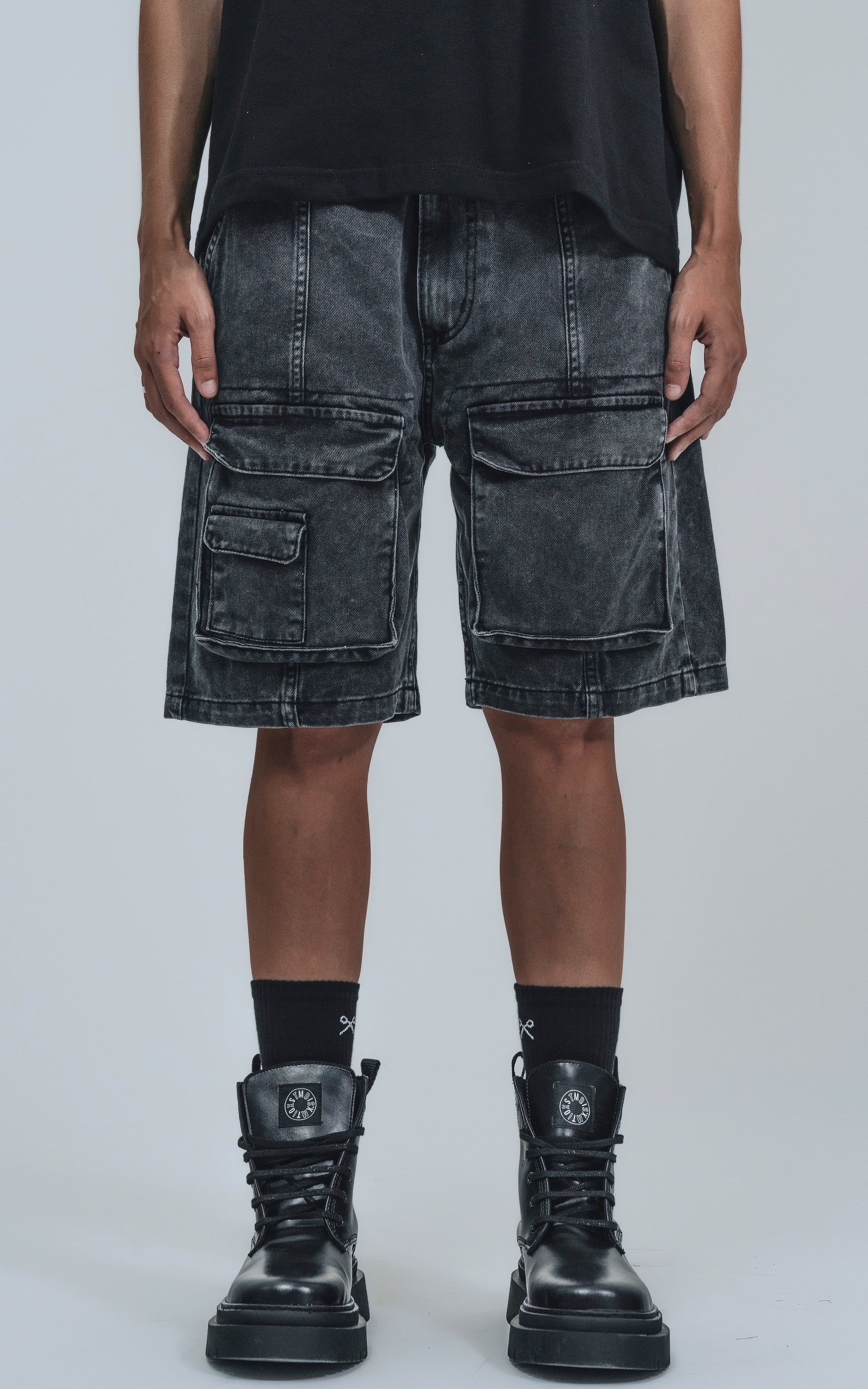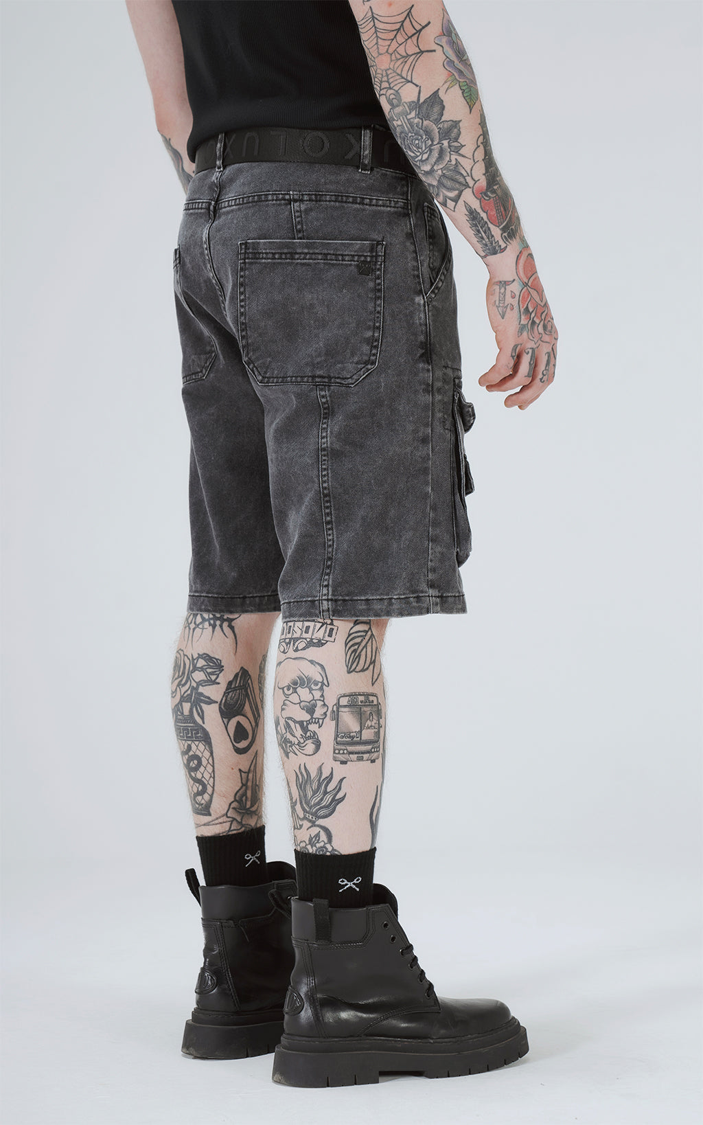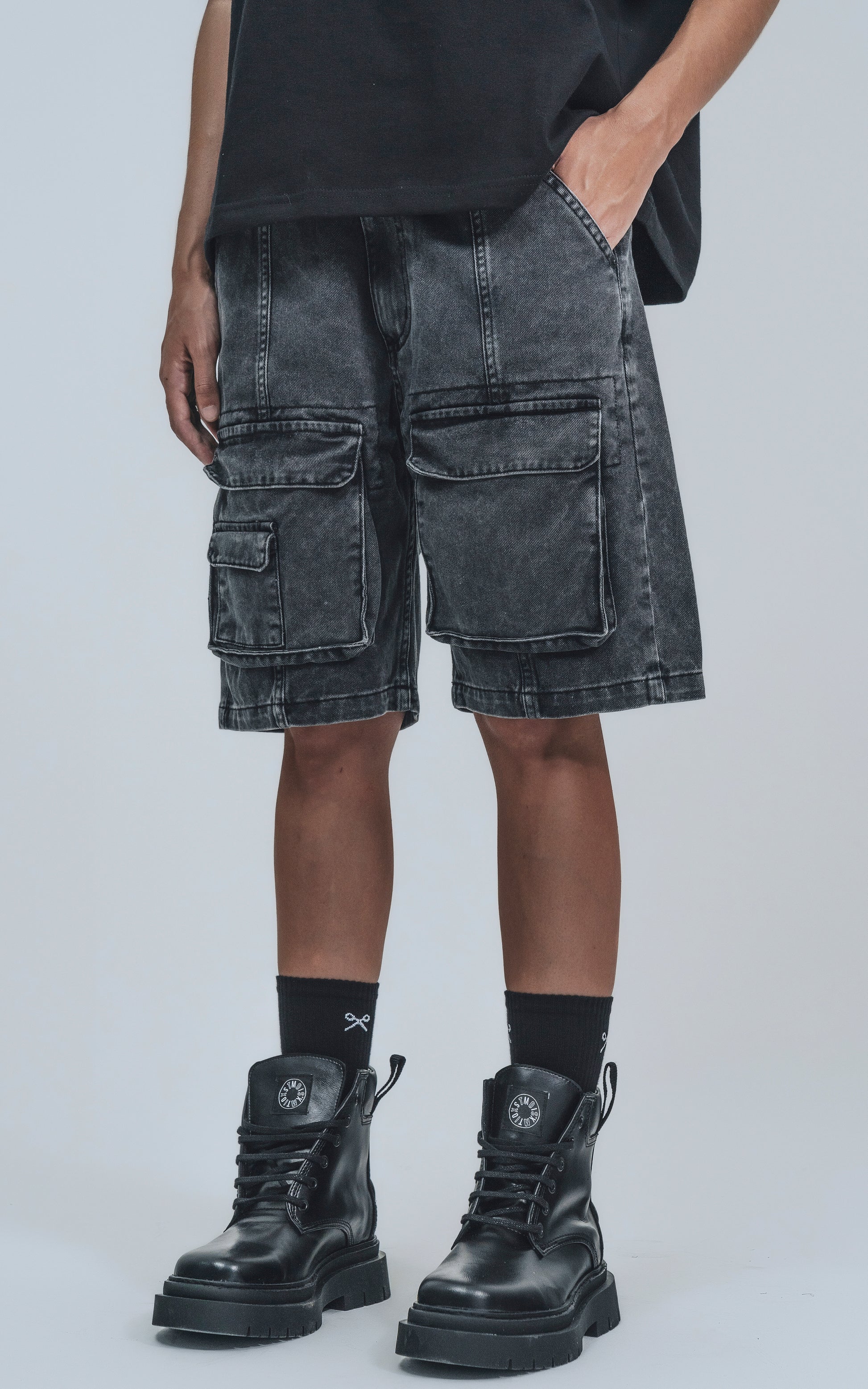 Bermuda de denim calce oversize estilo cargo con múltiples bolsillos y efecto desgaste.