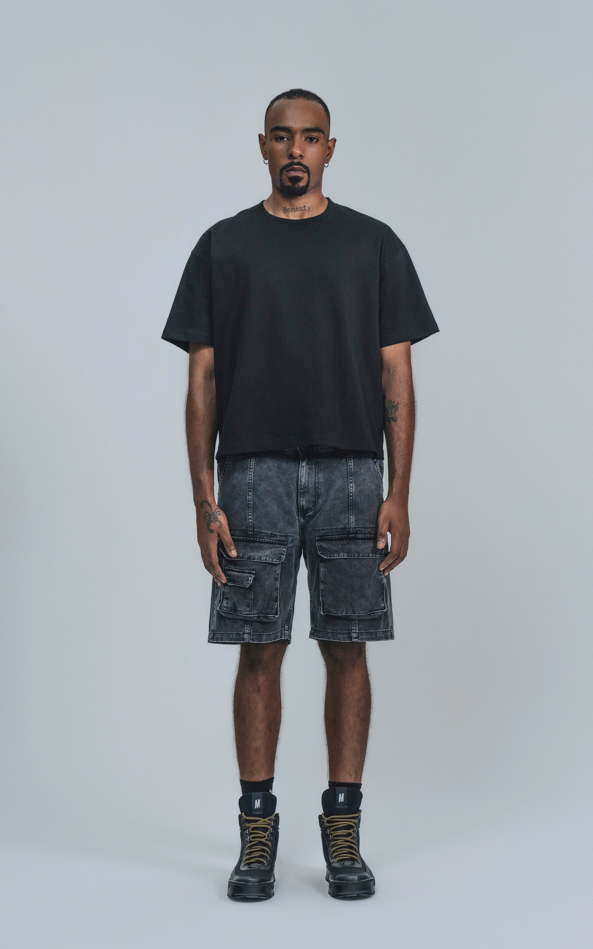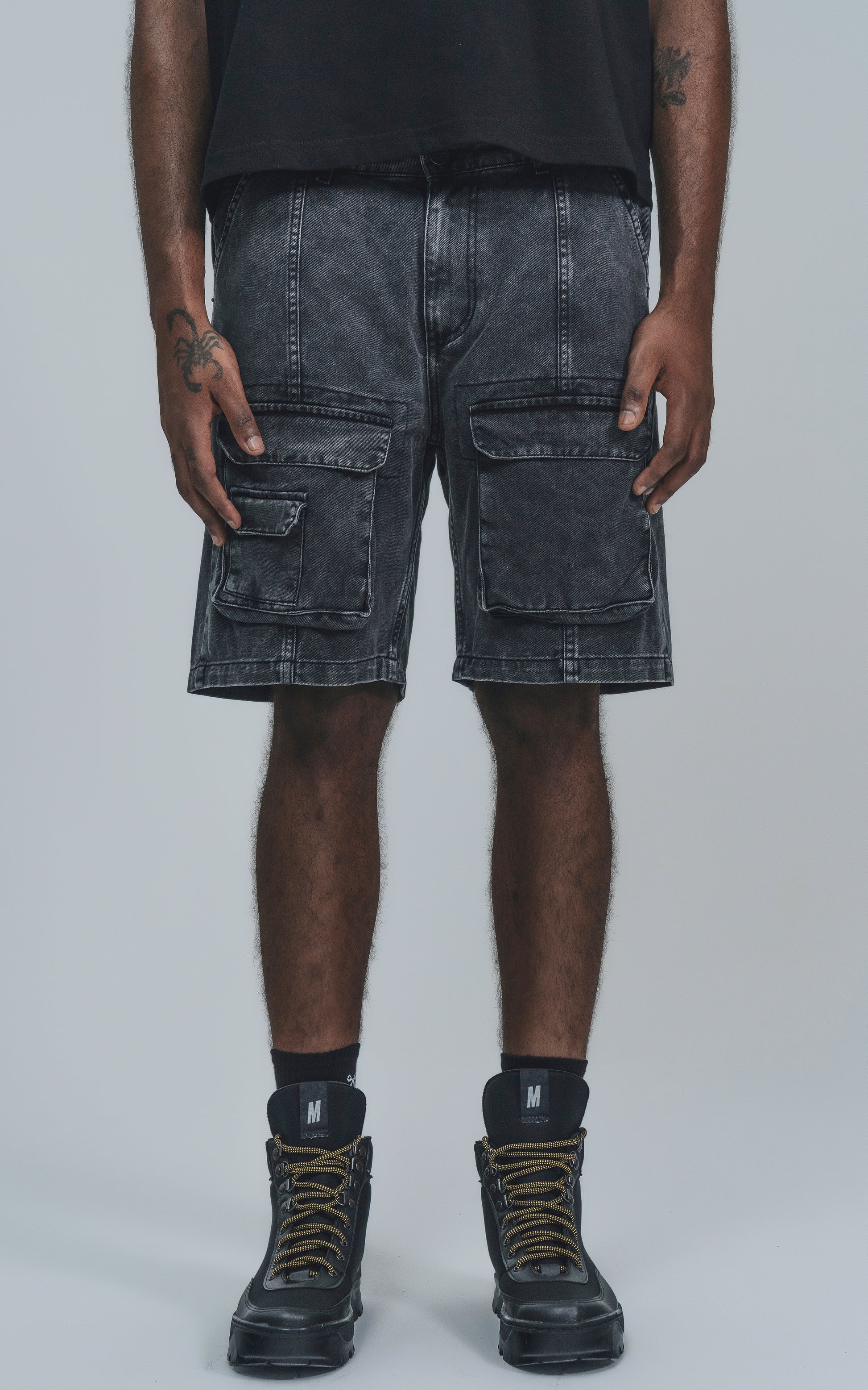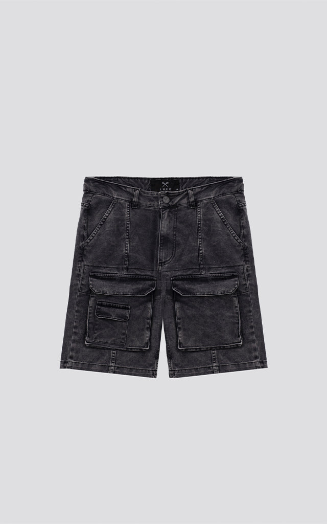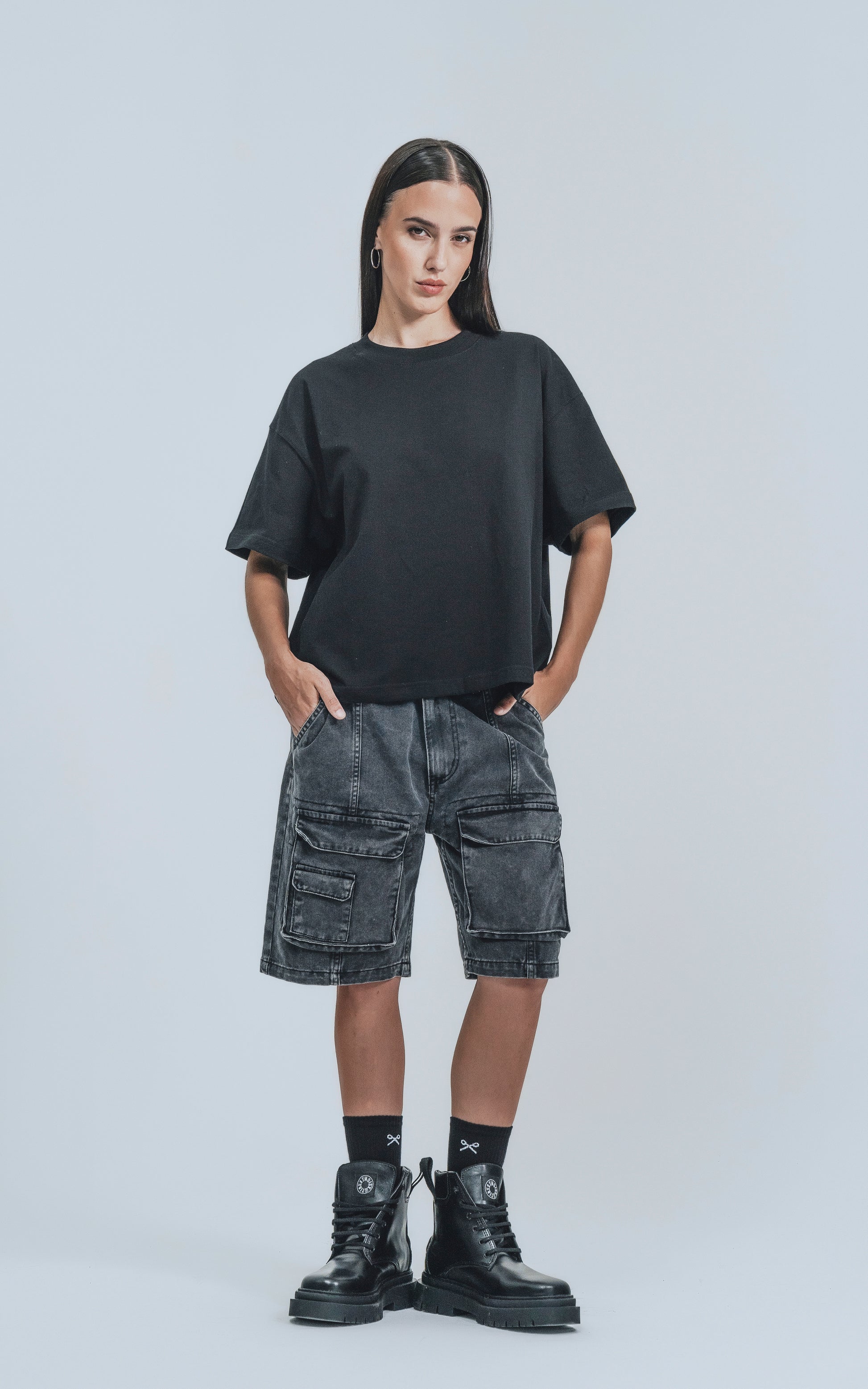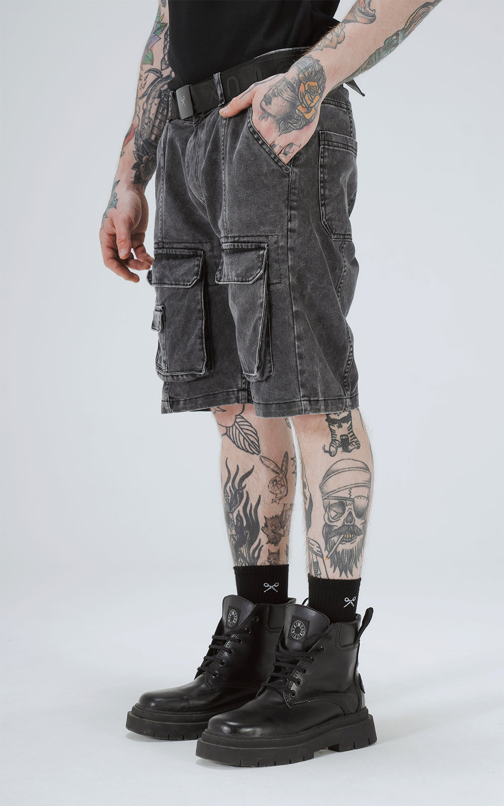 Bermuda de denim calce oversize estilo cargo con múltiples bolsillos y efecto desgaste.