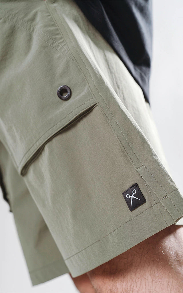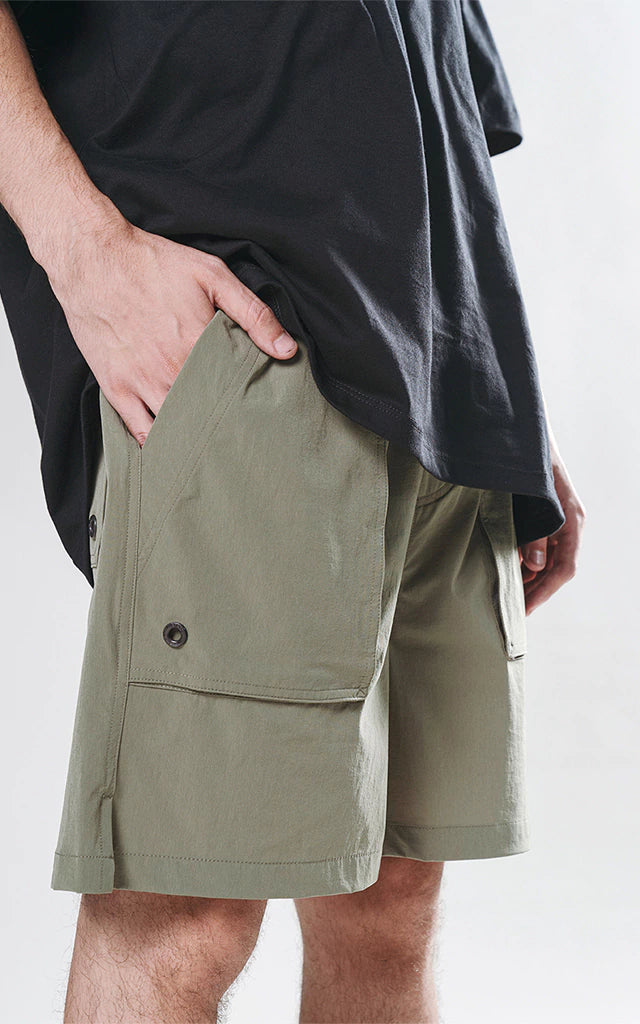Bermuda técnica, multi pocket con detalles reflectivos cinco bolsillos y cinturón con hebilla, calce oversize confeccionada en textil plano y liviano 100% poliéster.