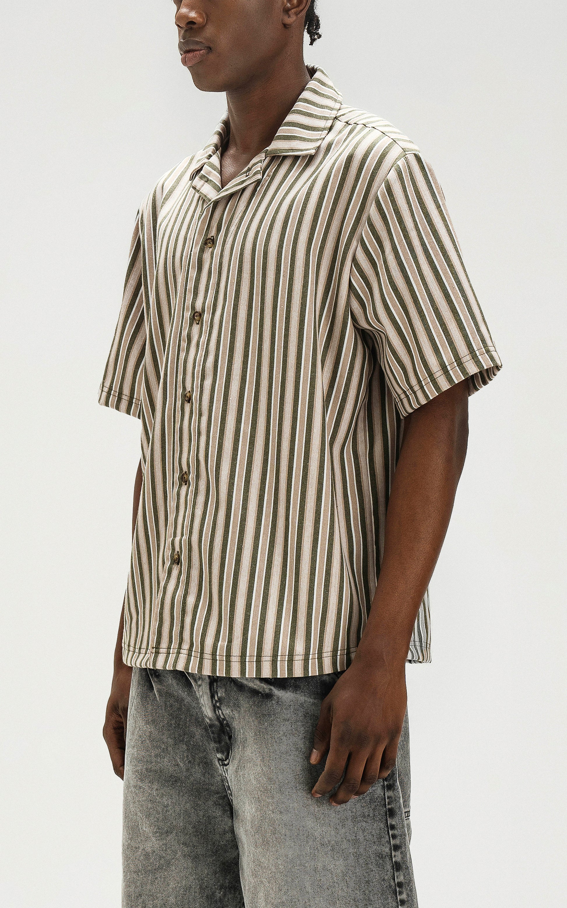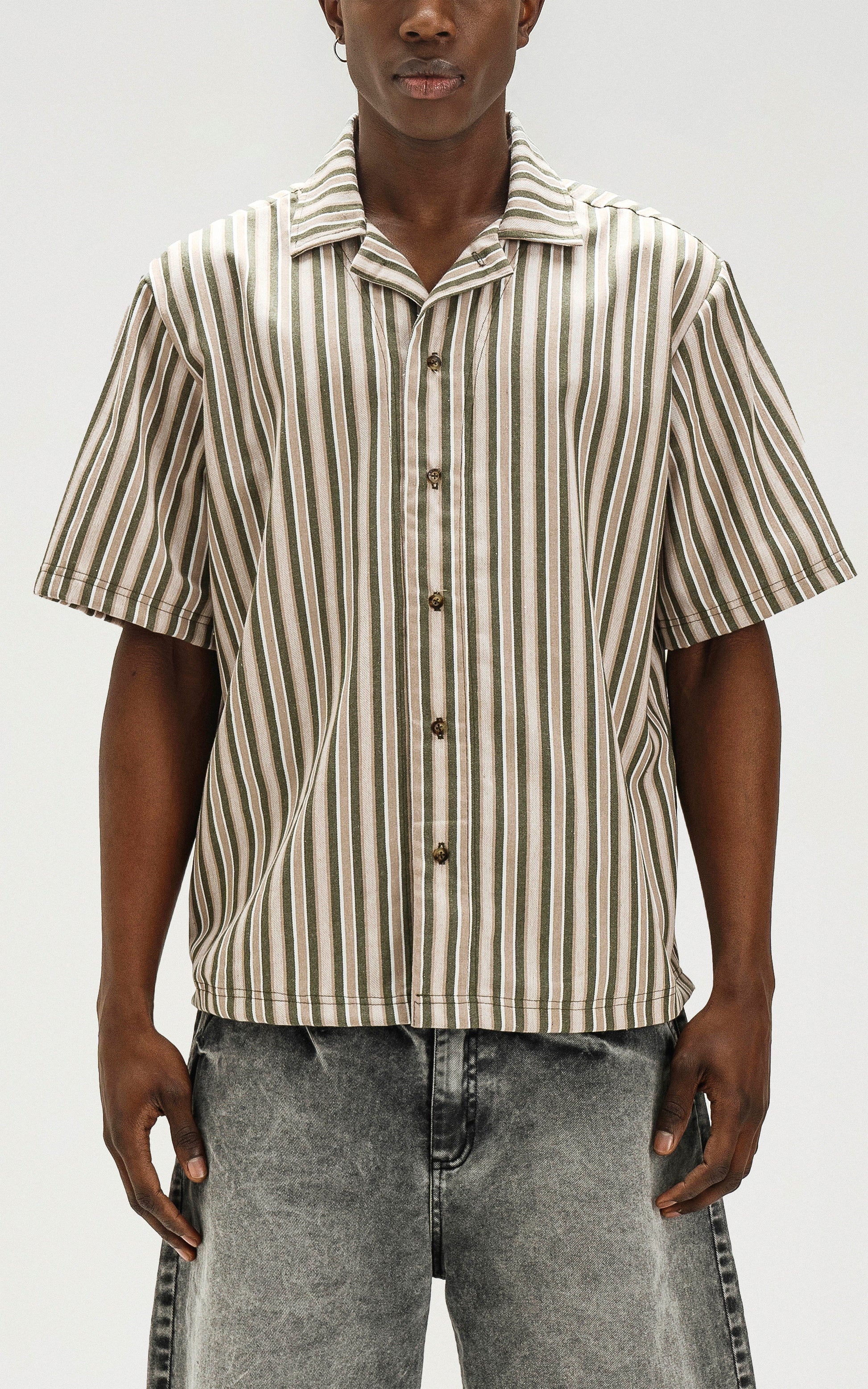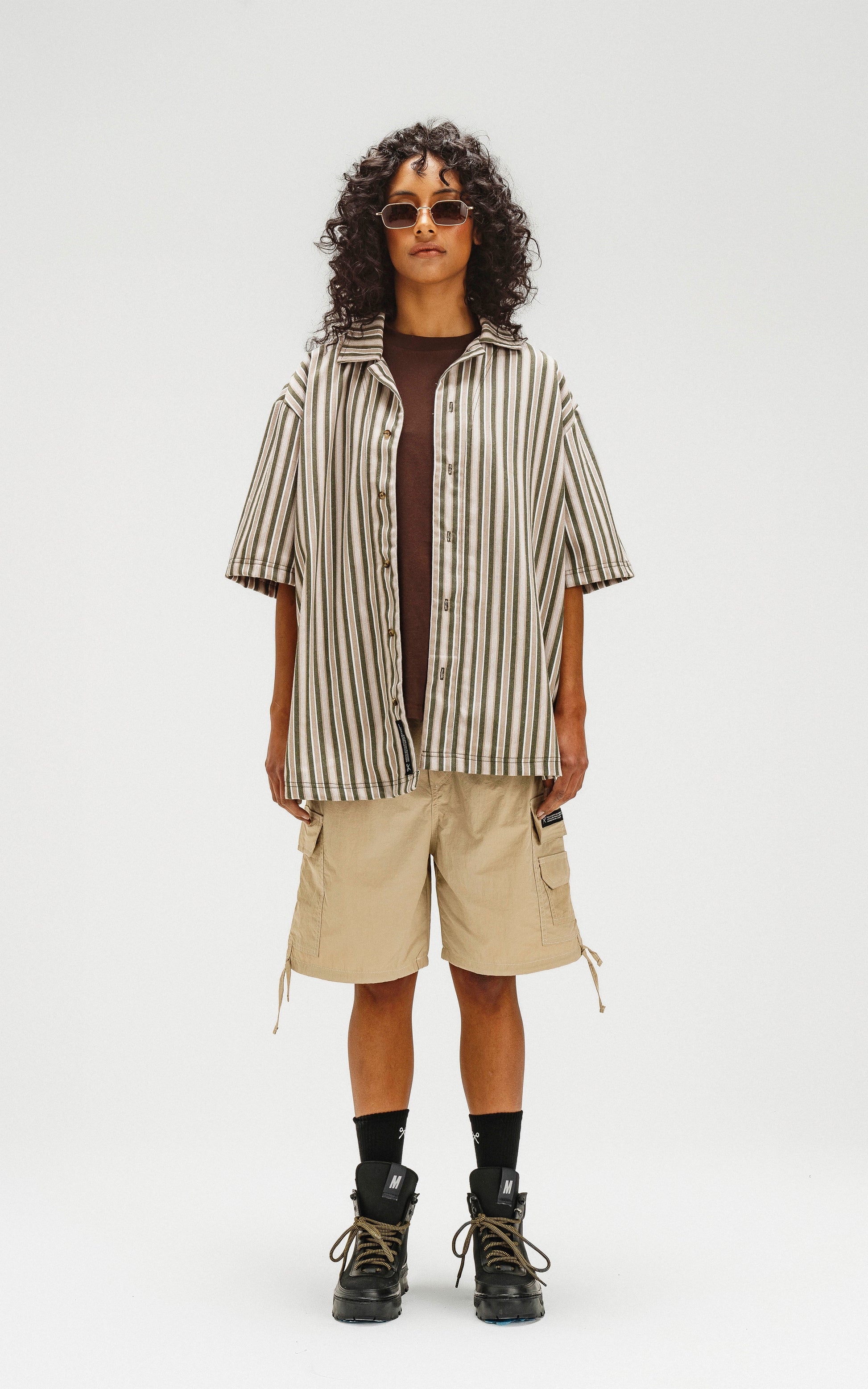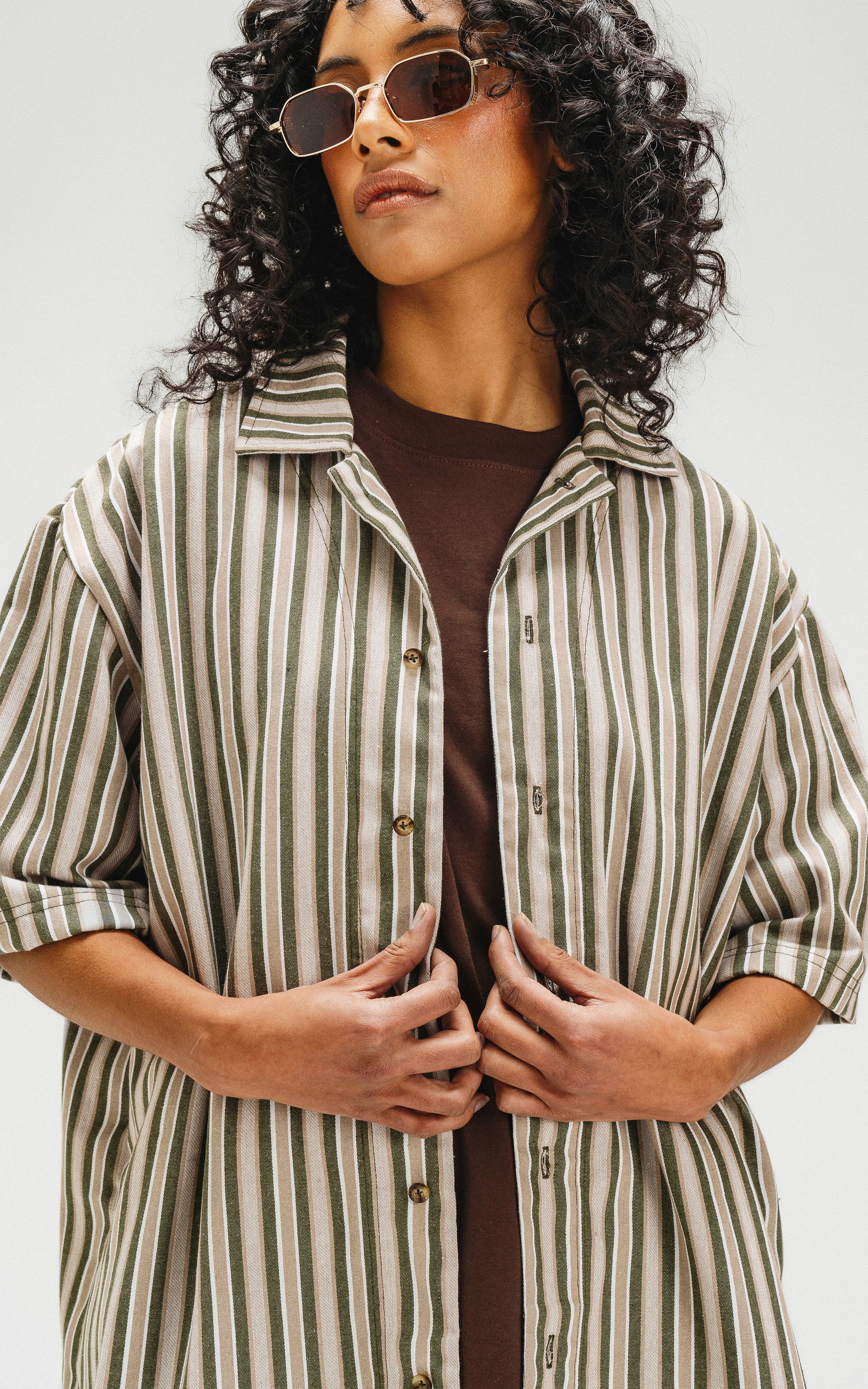 Camisa manga corta, con cuello abierto de calce oversize confeccionada en textil sarga liviana.