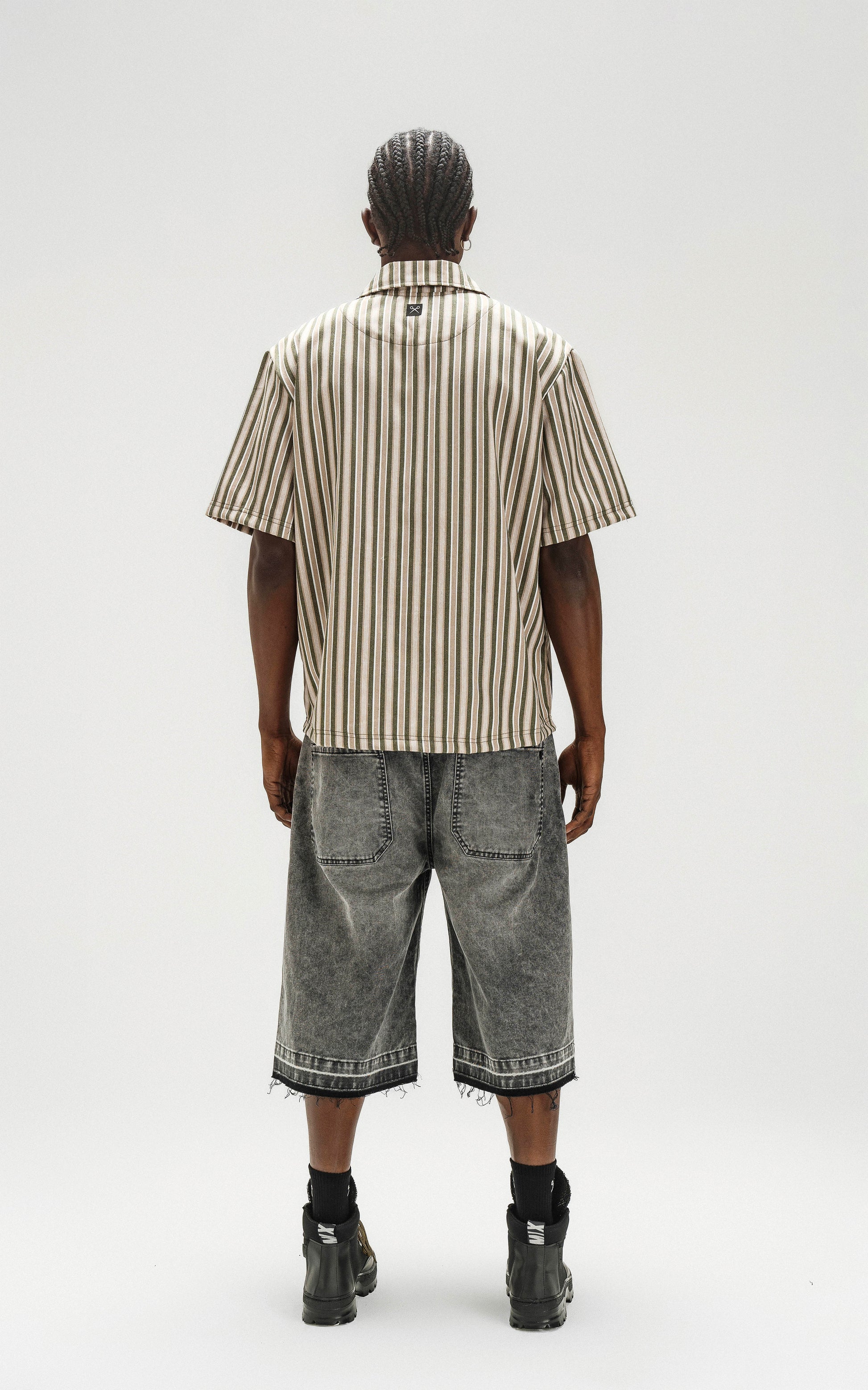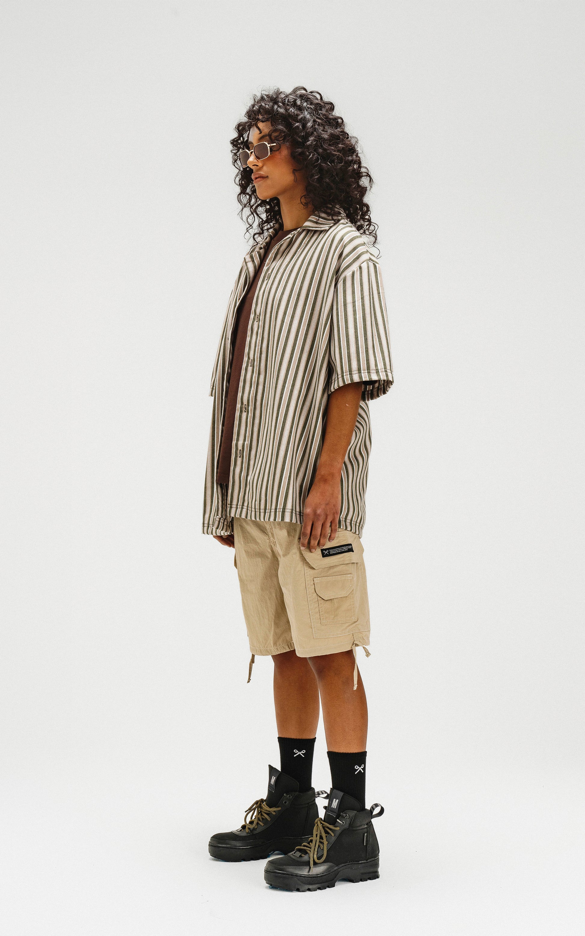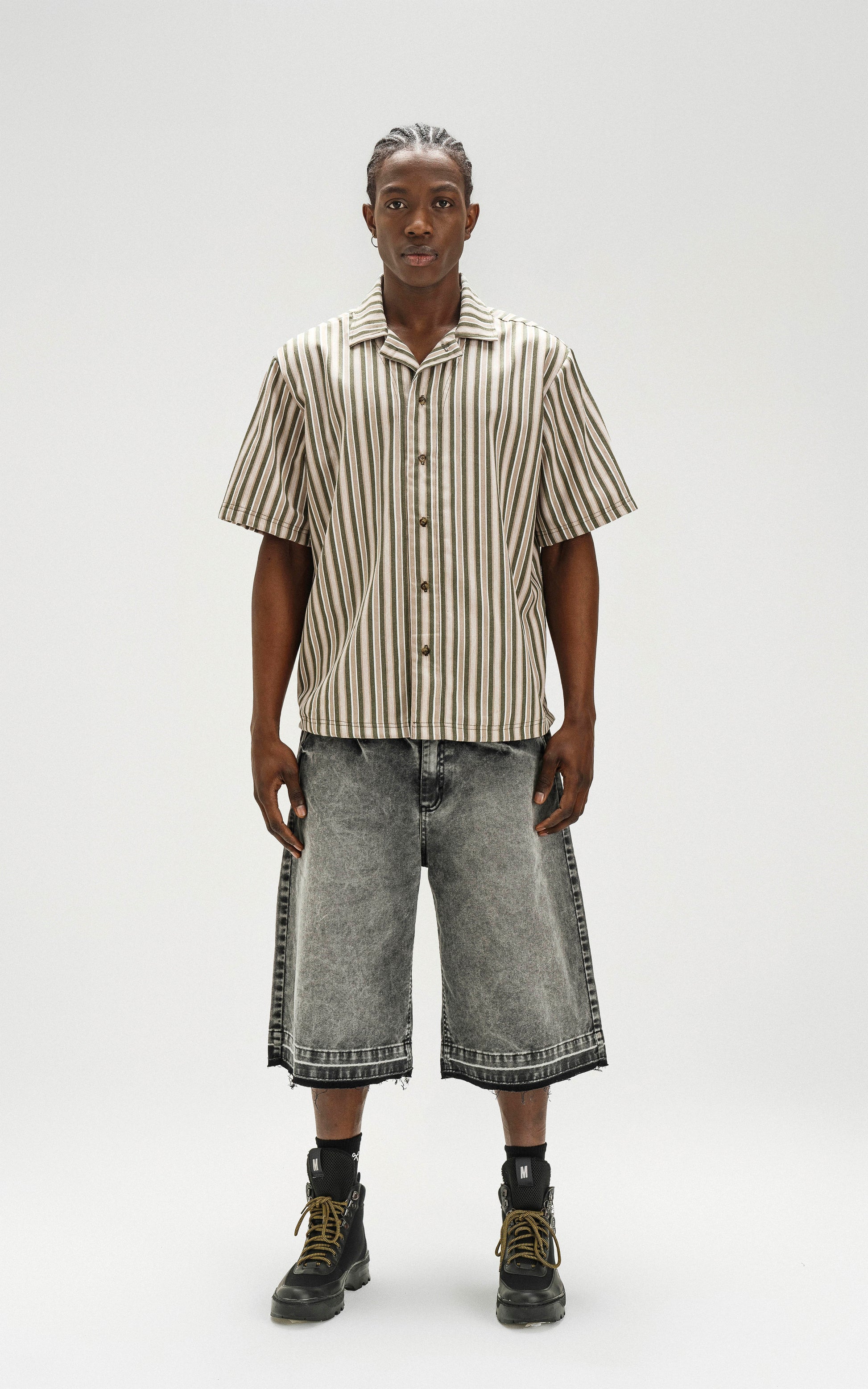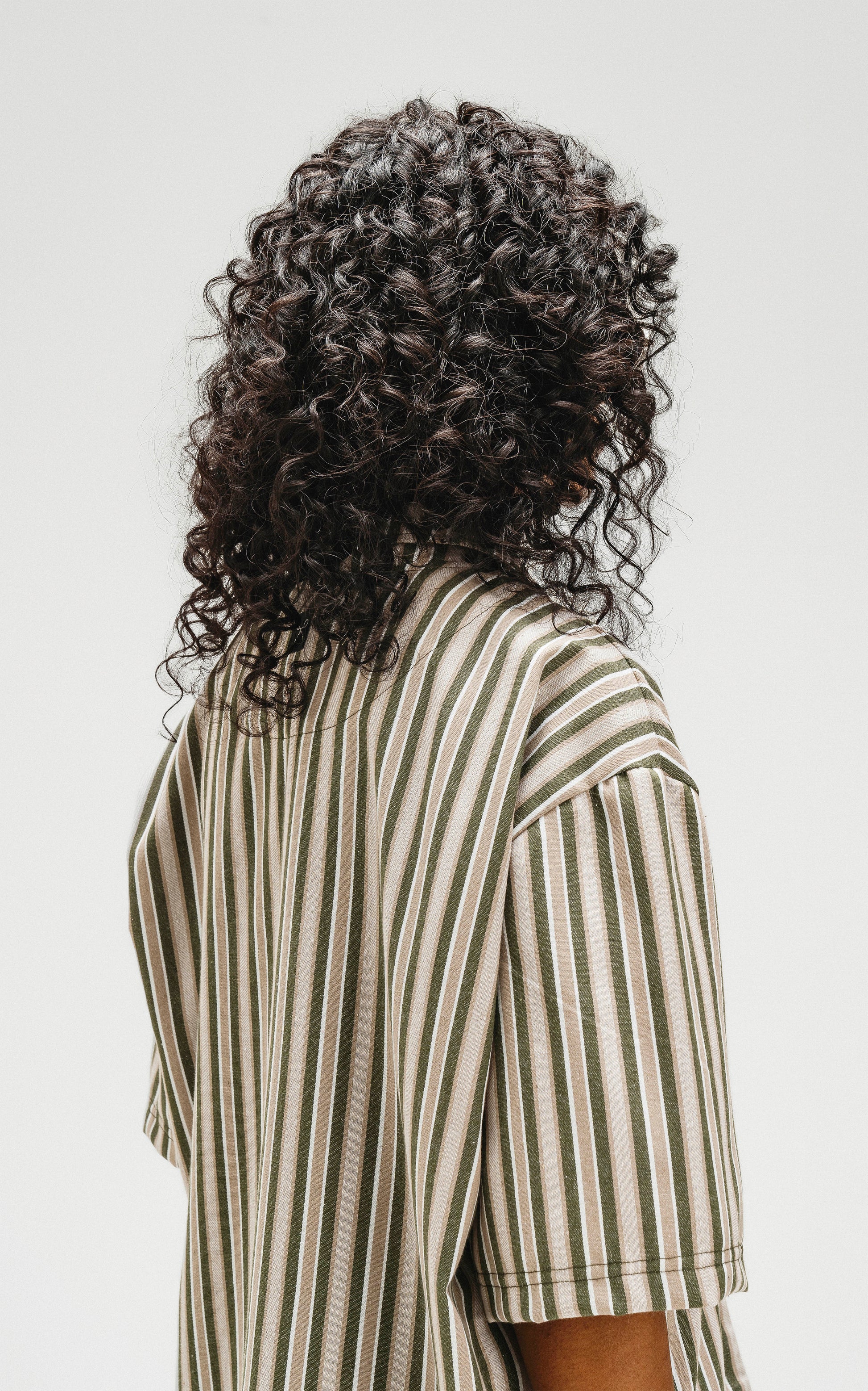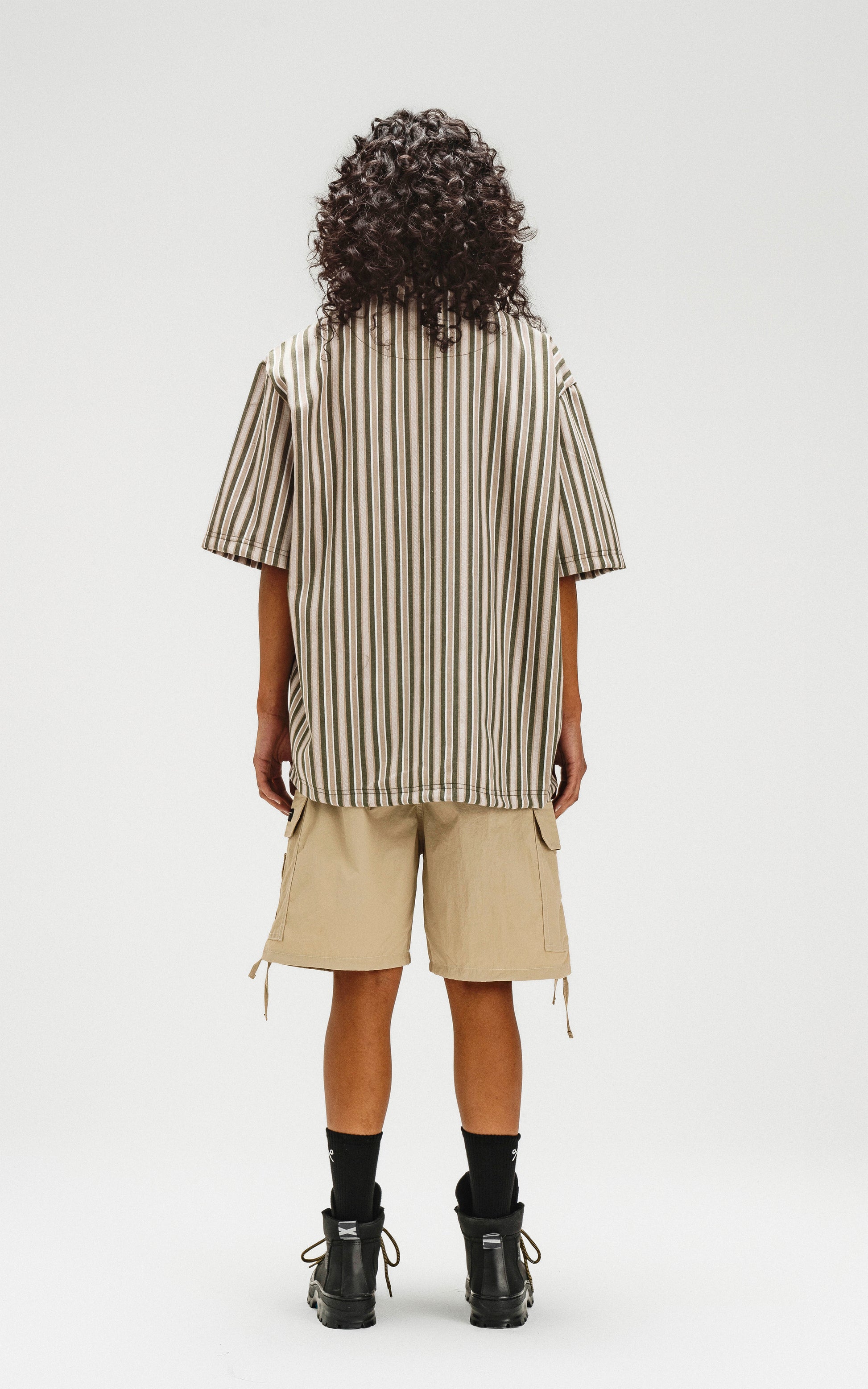Camisa manga corta, con cuello abierto de calce oversize confeccionada en textil sarga liviana.