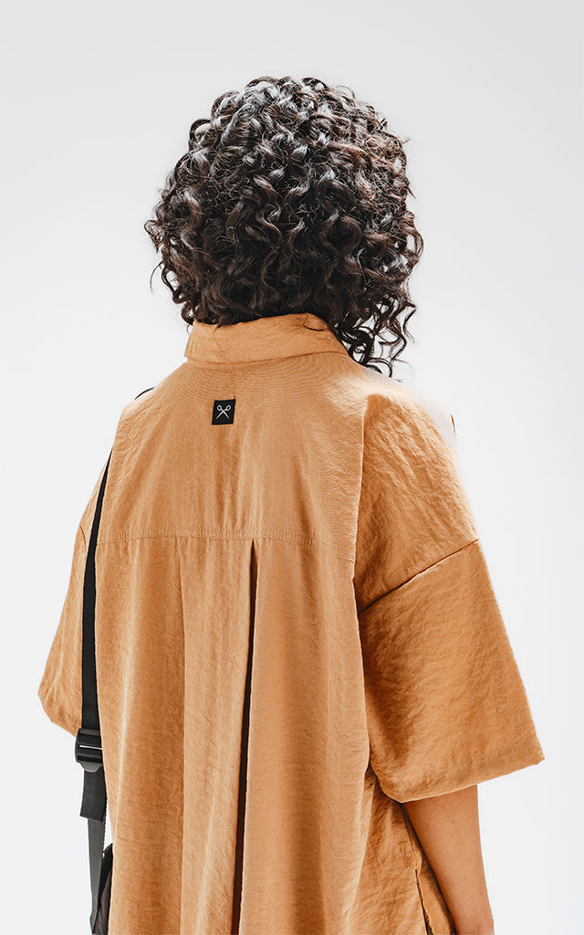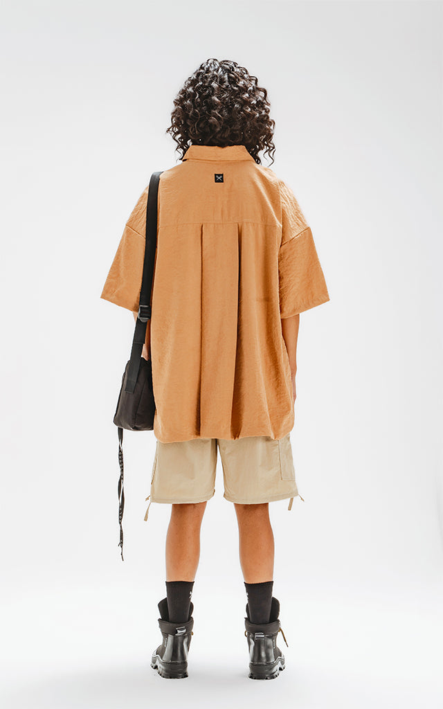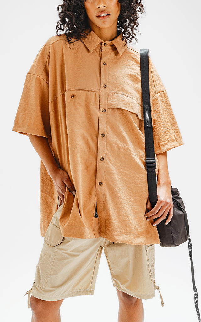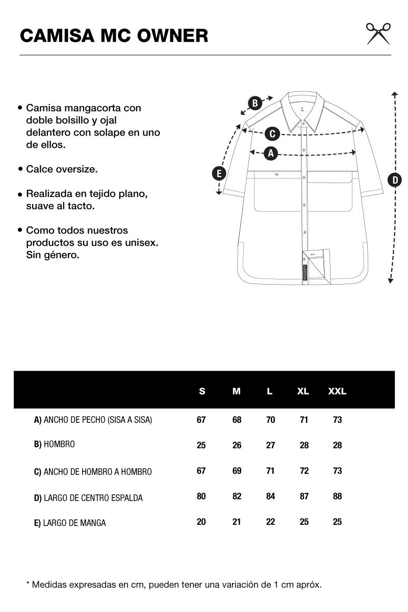 Camisa manga corta con doble bolsillo ojal en delantero con solapa en uno de ellos, realizada en tejido plano, suave al tacto, silueta oversize.