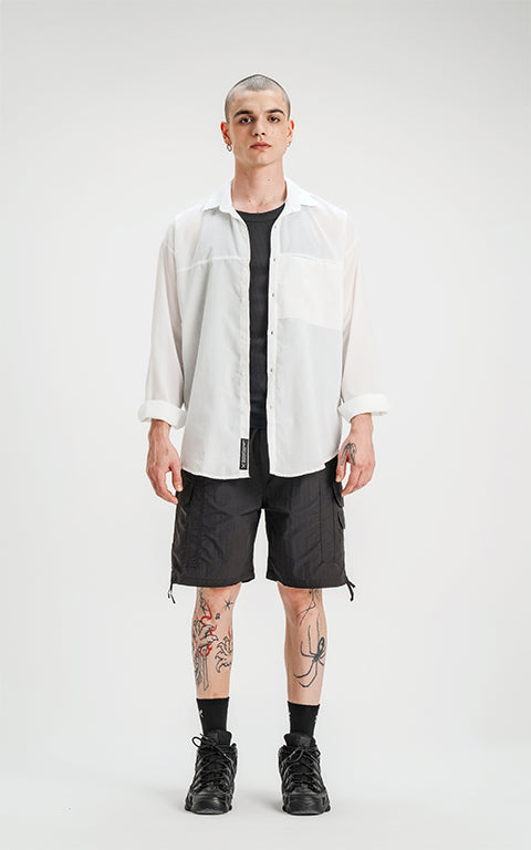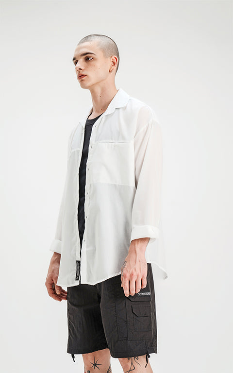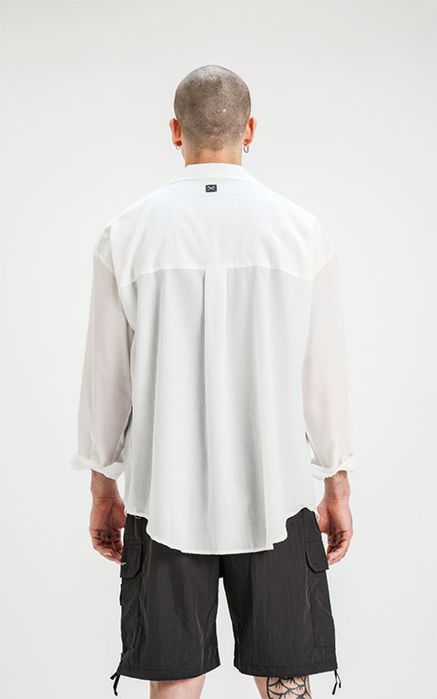 Camisa manga larga con bolsillo con ojal y botón en delantero, de calce oversize confeccionada en textil plano fresco y liviano.