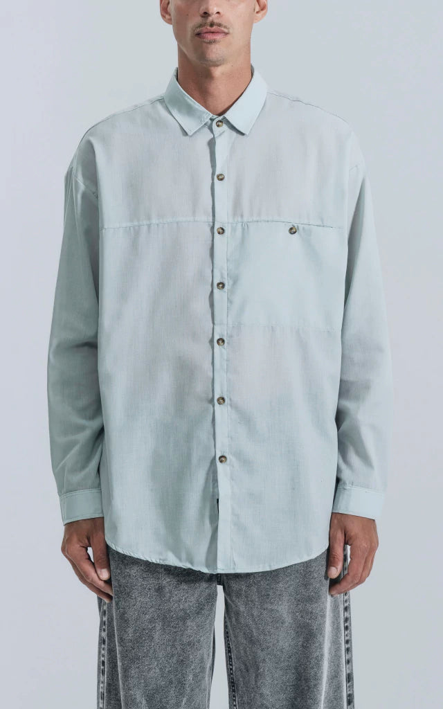 Camisa manga larga con bolsillo con ojal y botón en delantero, de calce oversize confeccionada en textil plano fresco y liviano.