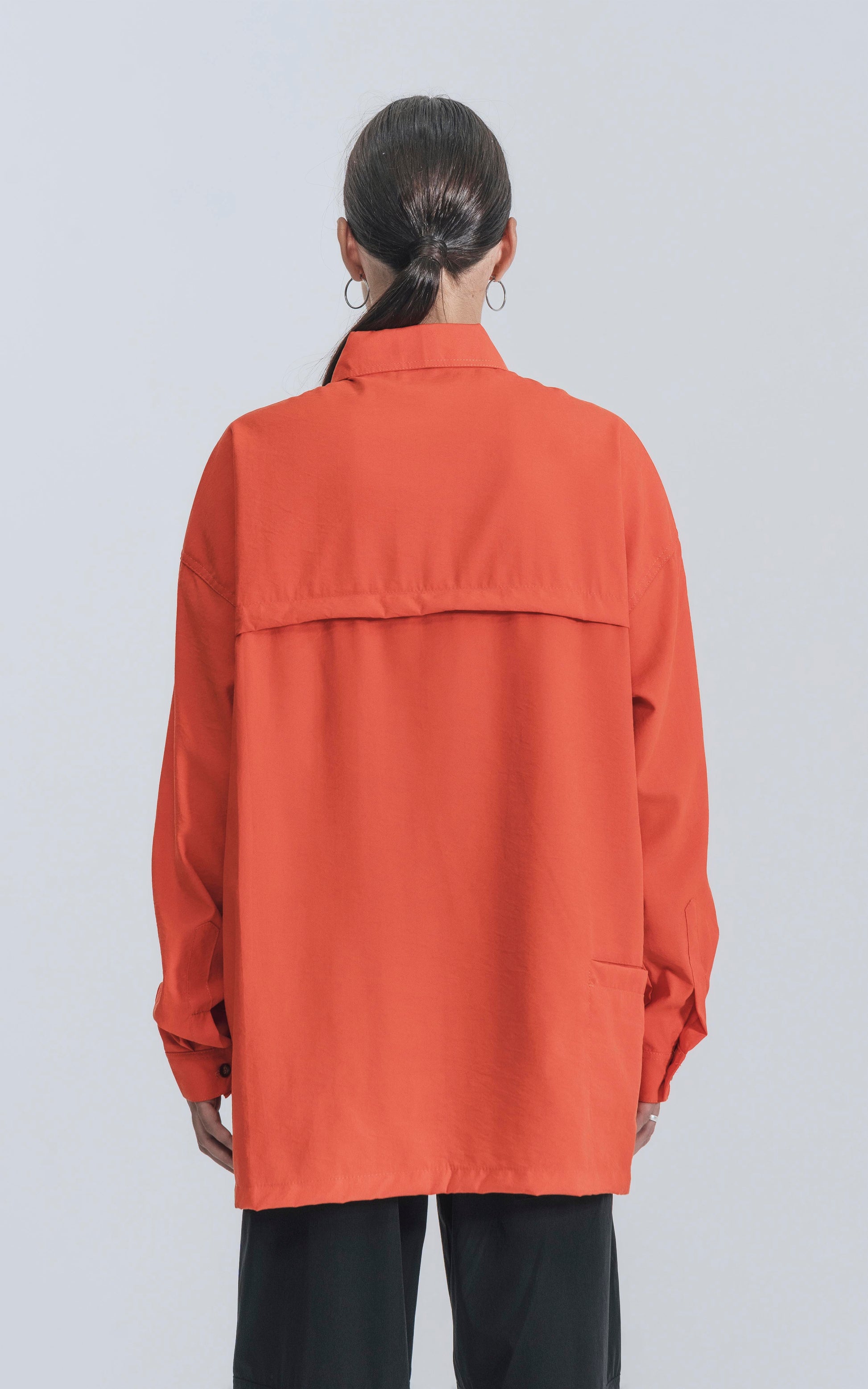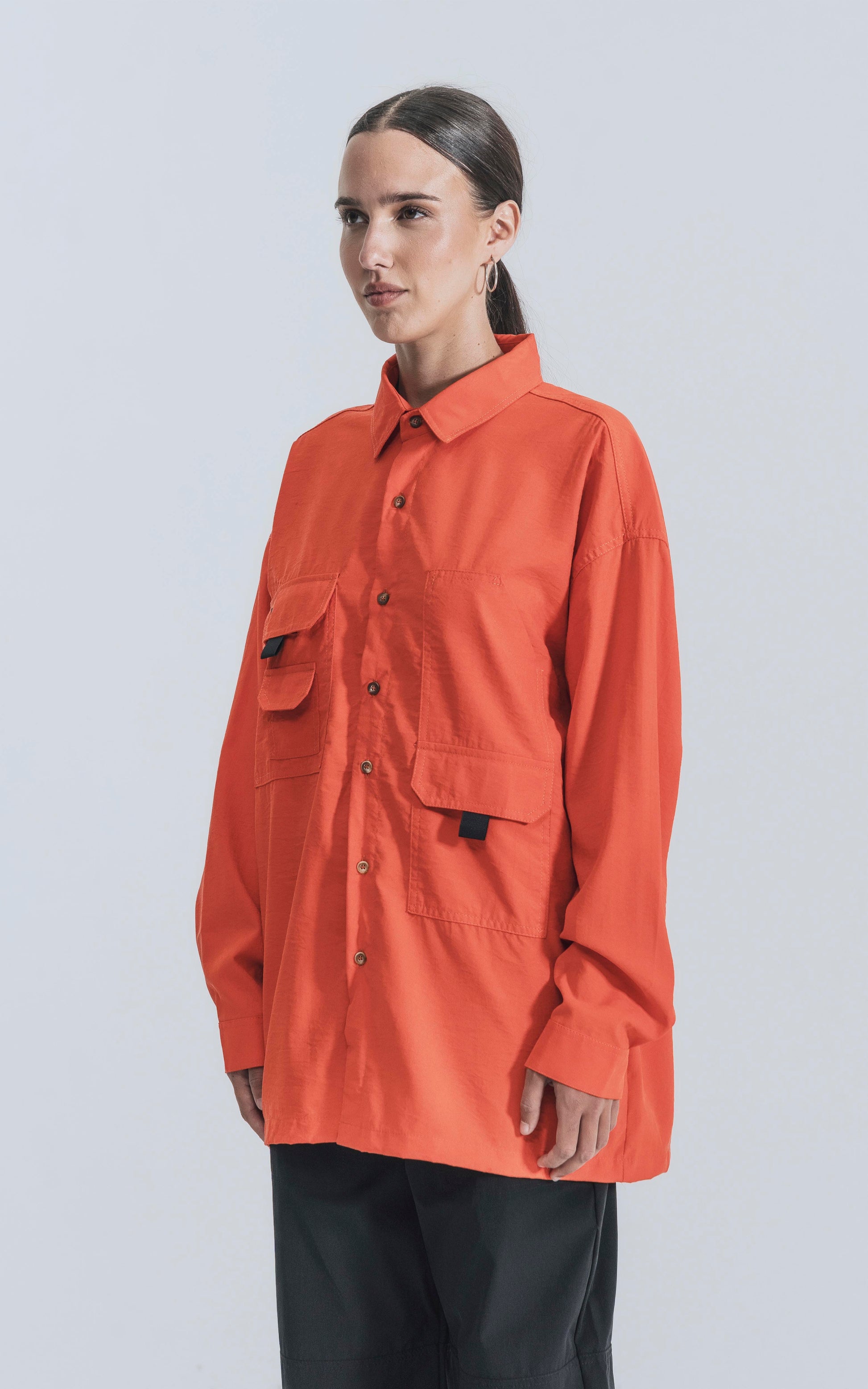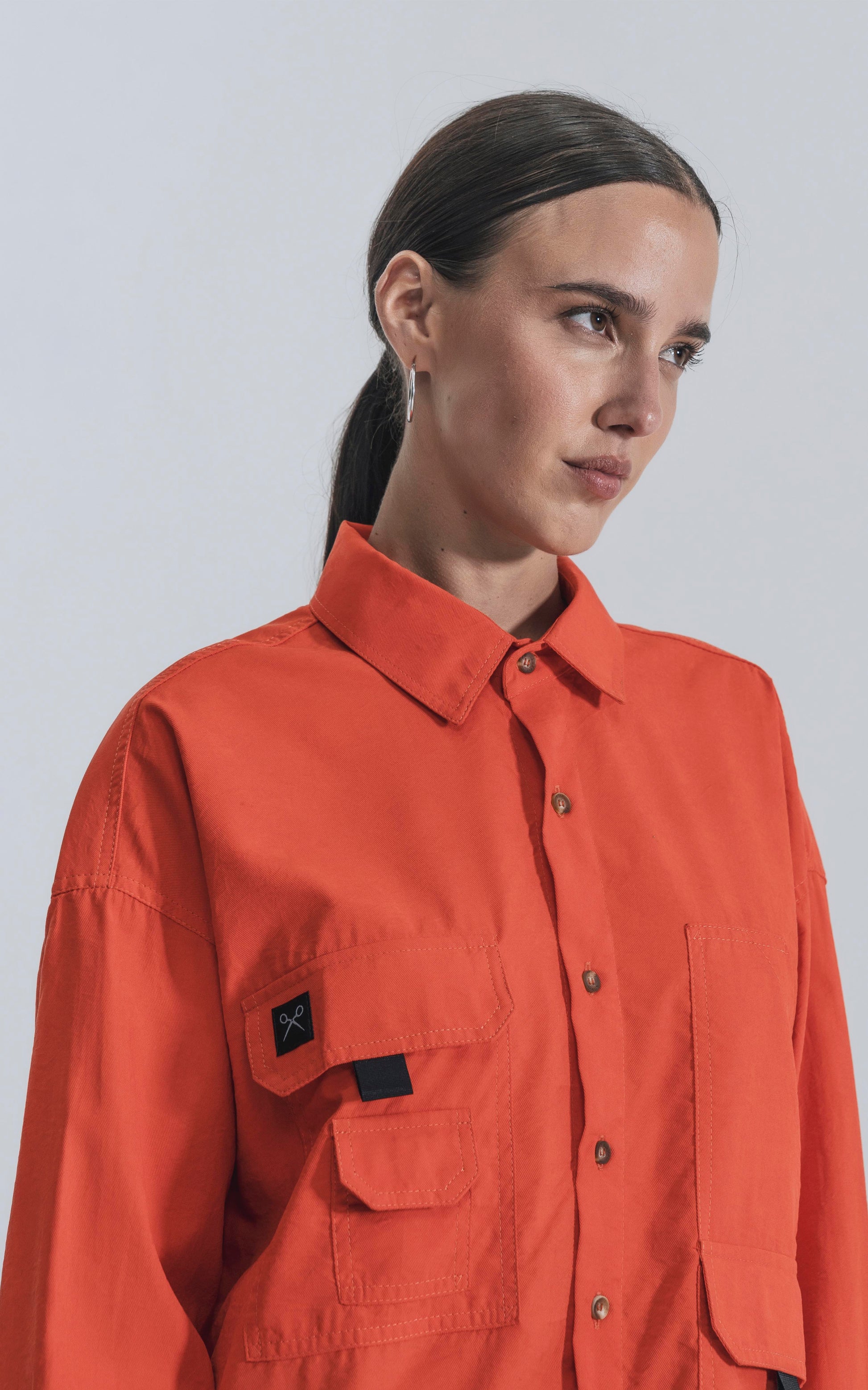 Camisa manga larga, estilo técnica con múltiples bolsillos delanteros y un bolsillo en la parte inferior de espalda, botones en cartera y mangas, calce oversize, confeccionada en textil ligero suave al tacto.