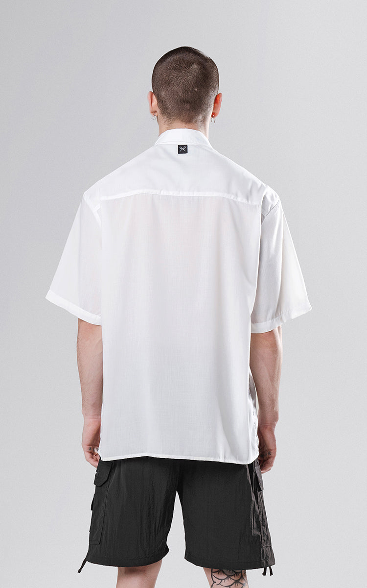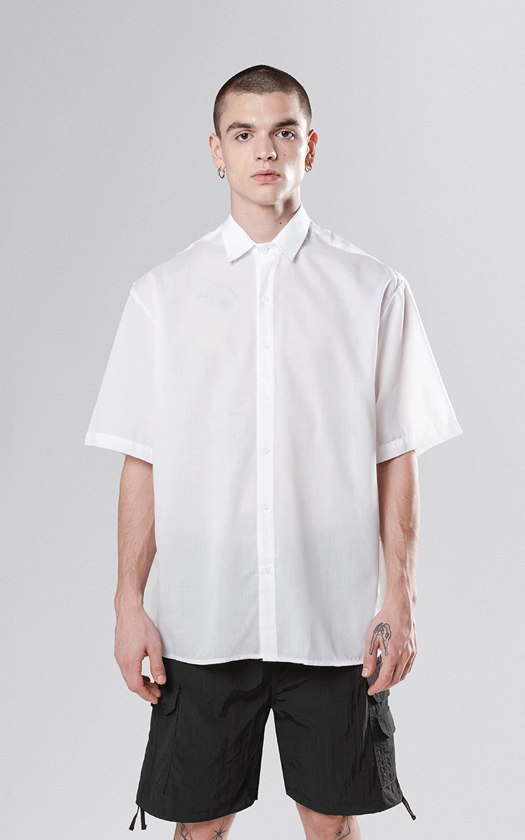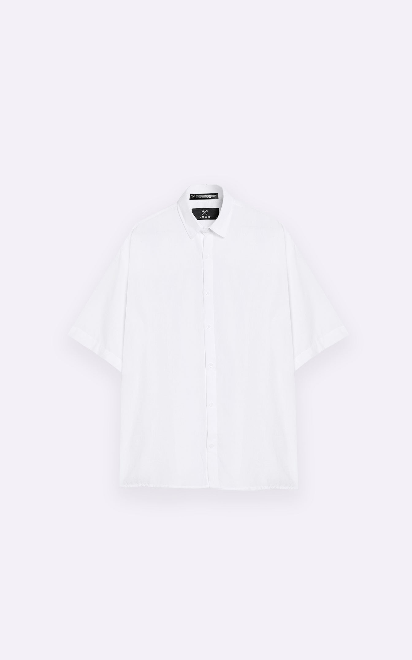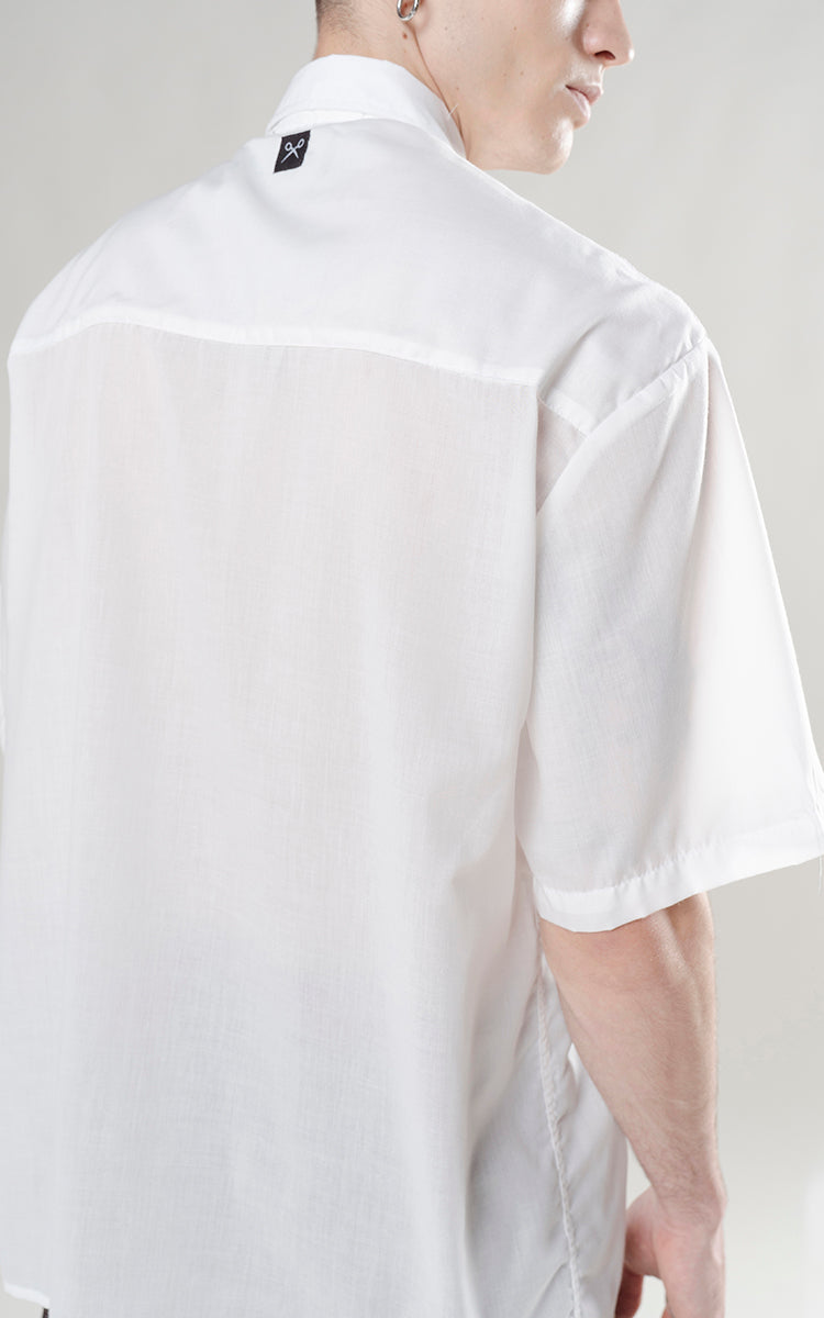Camisa manga corta calce oversize. Detalle de canesú en espalda. Su tela fina y liviana hacen a la prenda una opción fresca y cómoda.