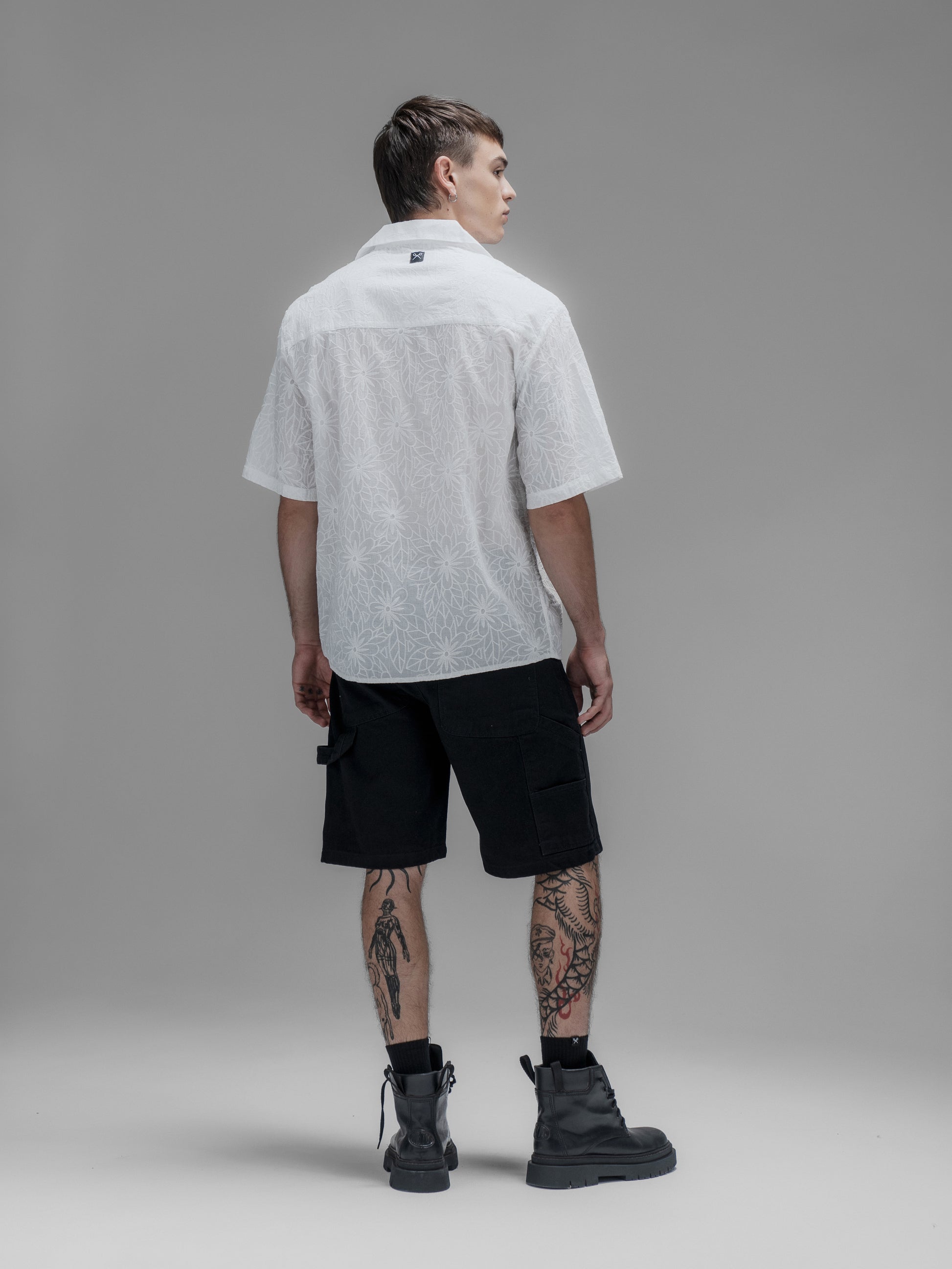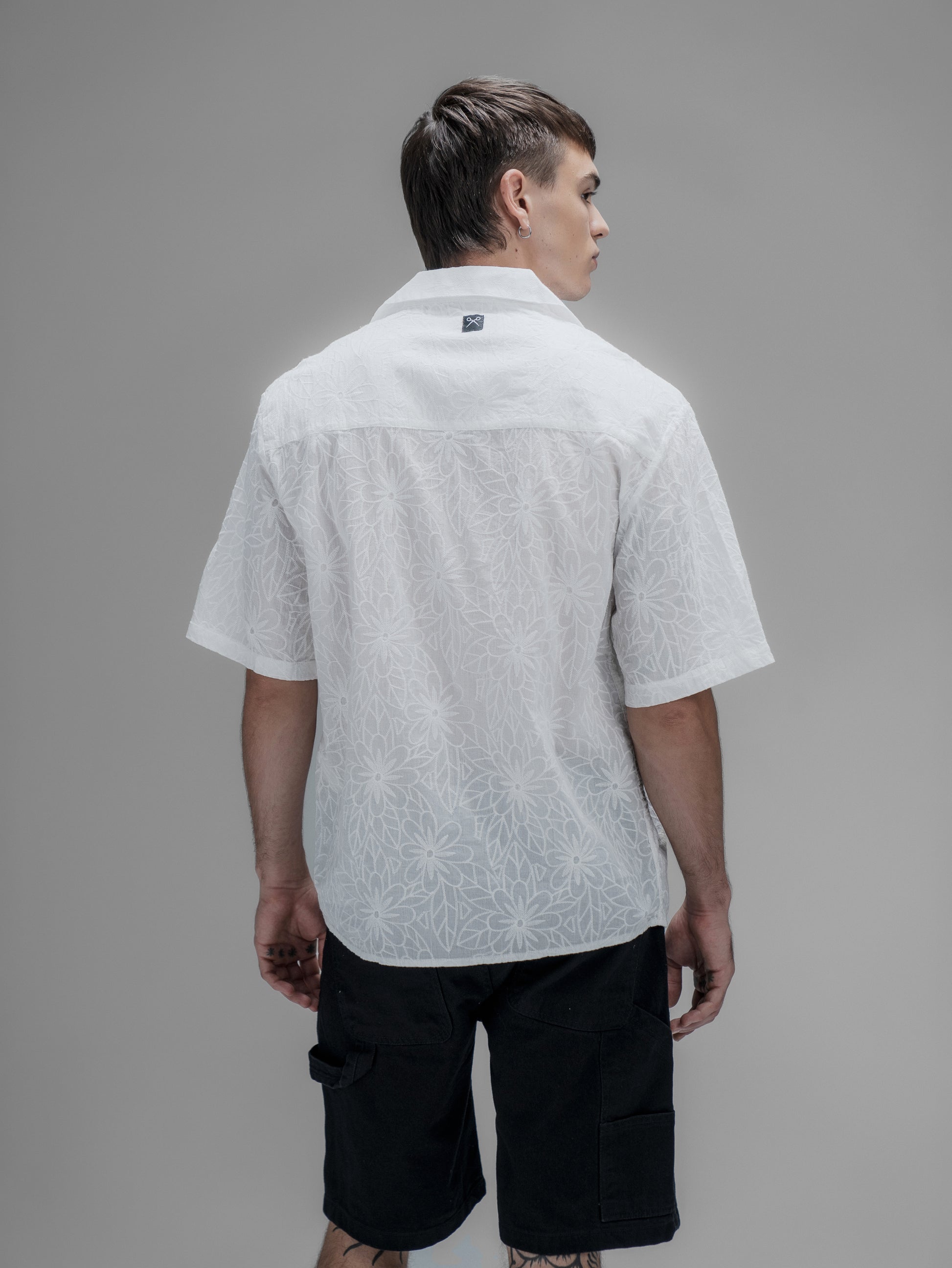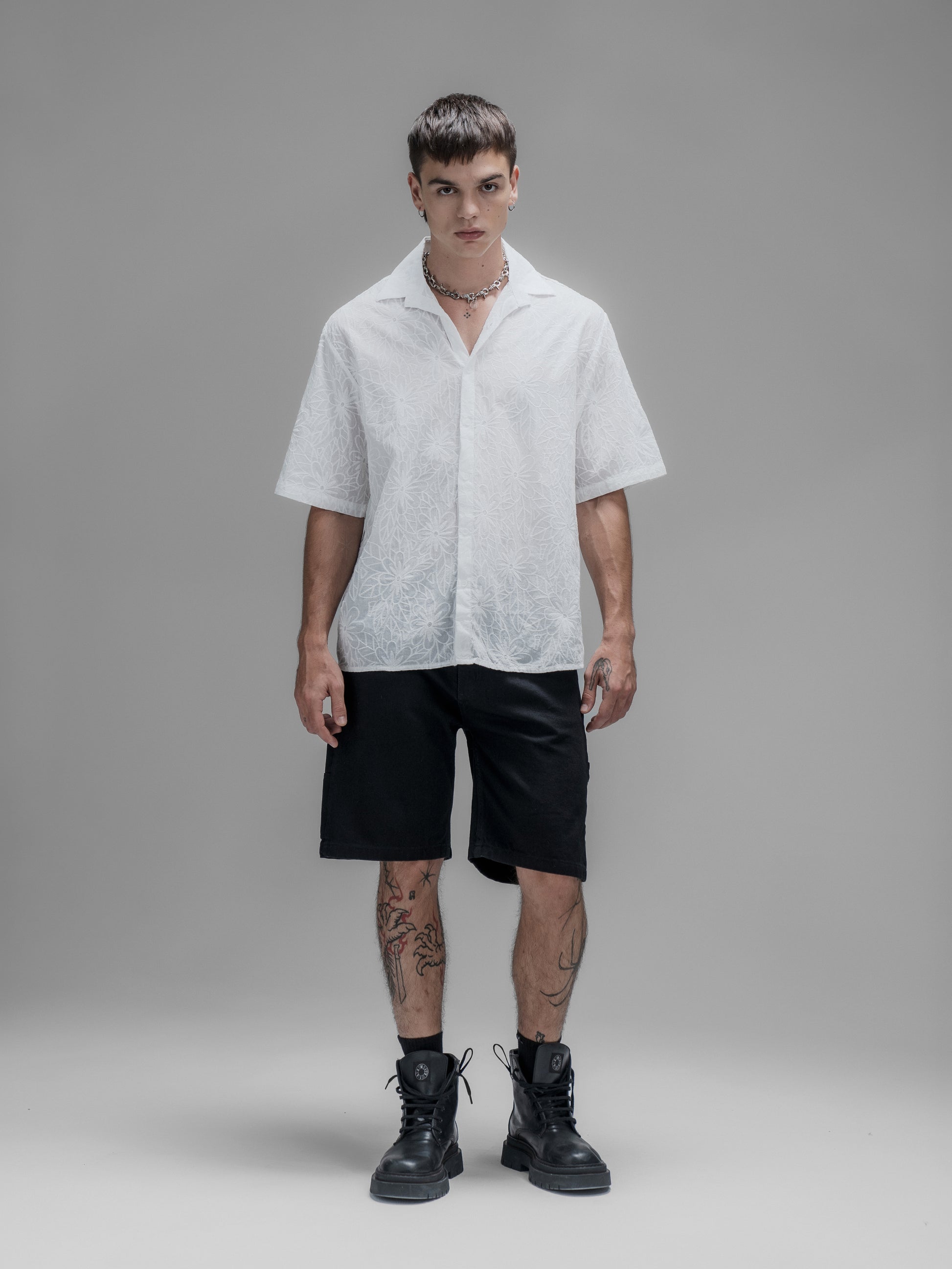 Camisa clásica, manga corta, de calce oversize, con cuello abierto, confeccionada en algodón bordado (broderie). Es una tela muy nita, por lo que resulta super liviana y fresca, óptima para usar en verano y sobre todo en eventos, porque su diseño no pasa desapercibido.