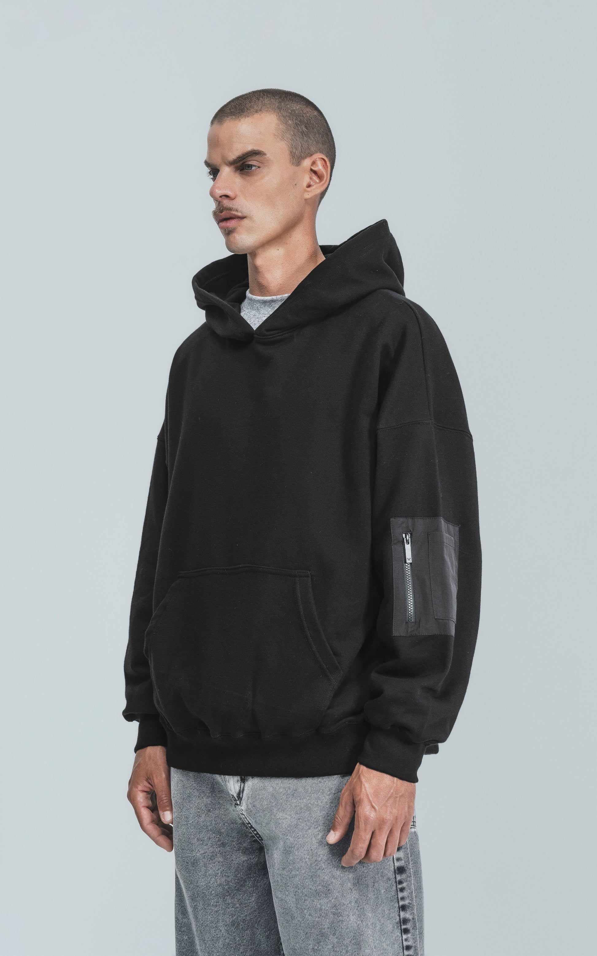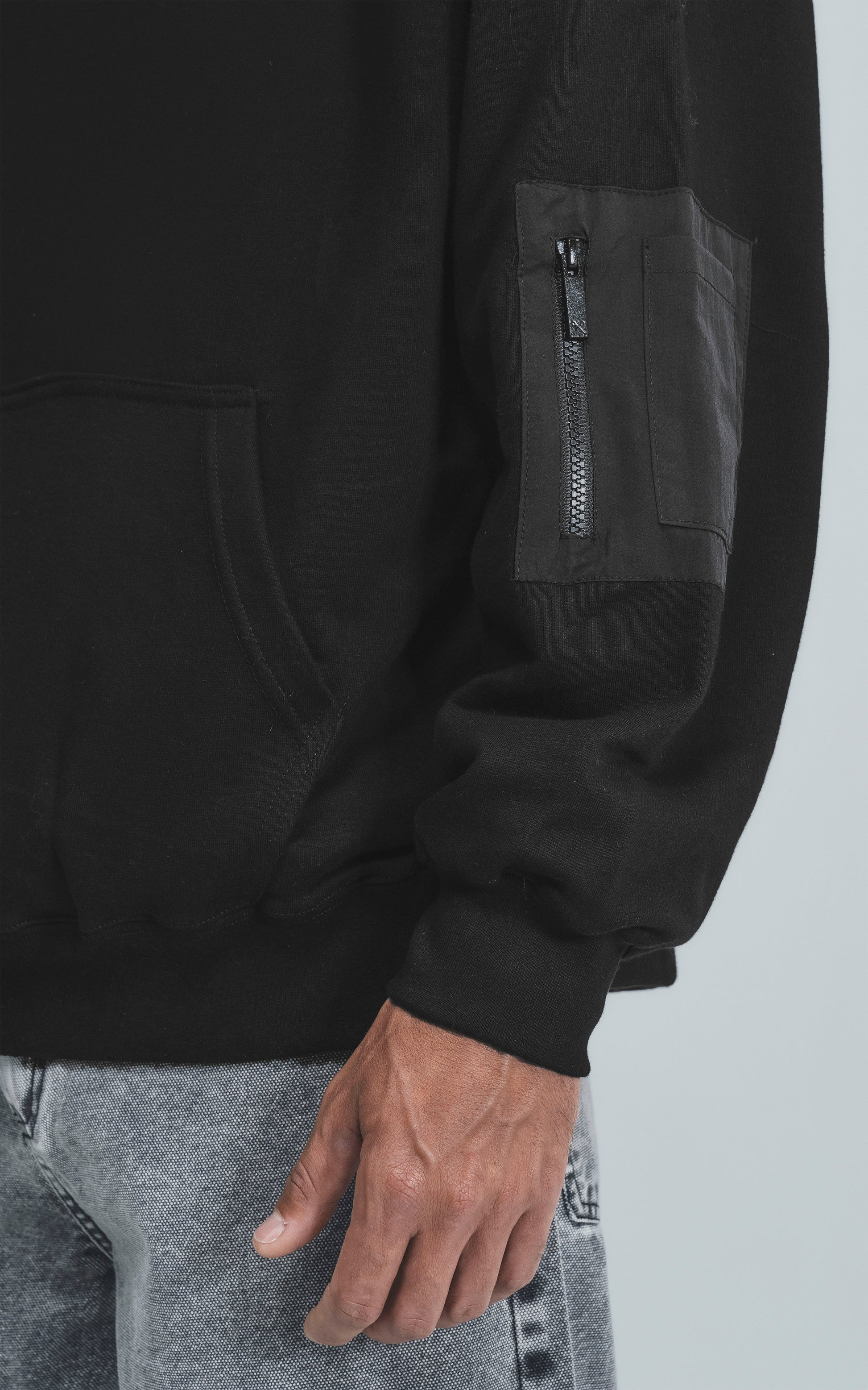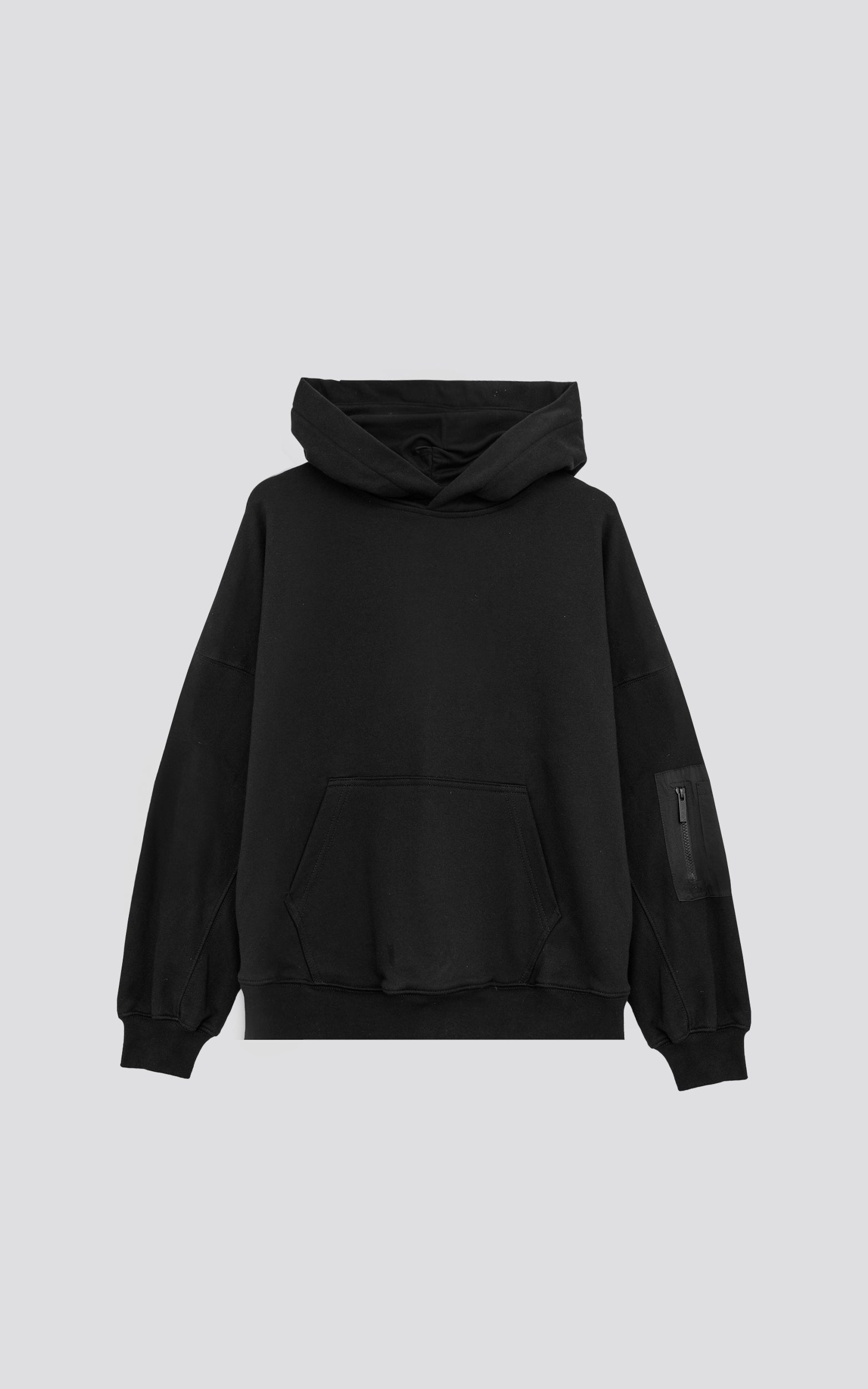Hoodie confeccionado en rústico 100% algodón, silueta oversize. Bolsillo de microfibra en manga estilo bomber con cierre. Incorporando capucha forrada, es la reversión de nuestro Buzo Hunter.