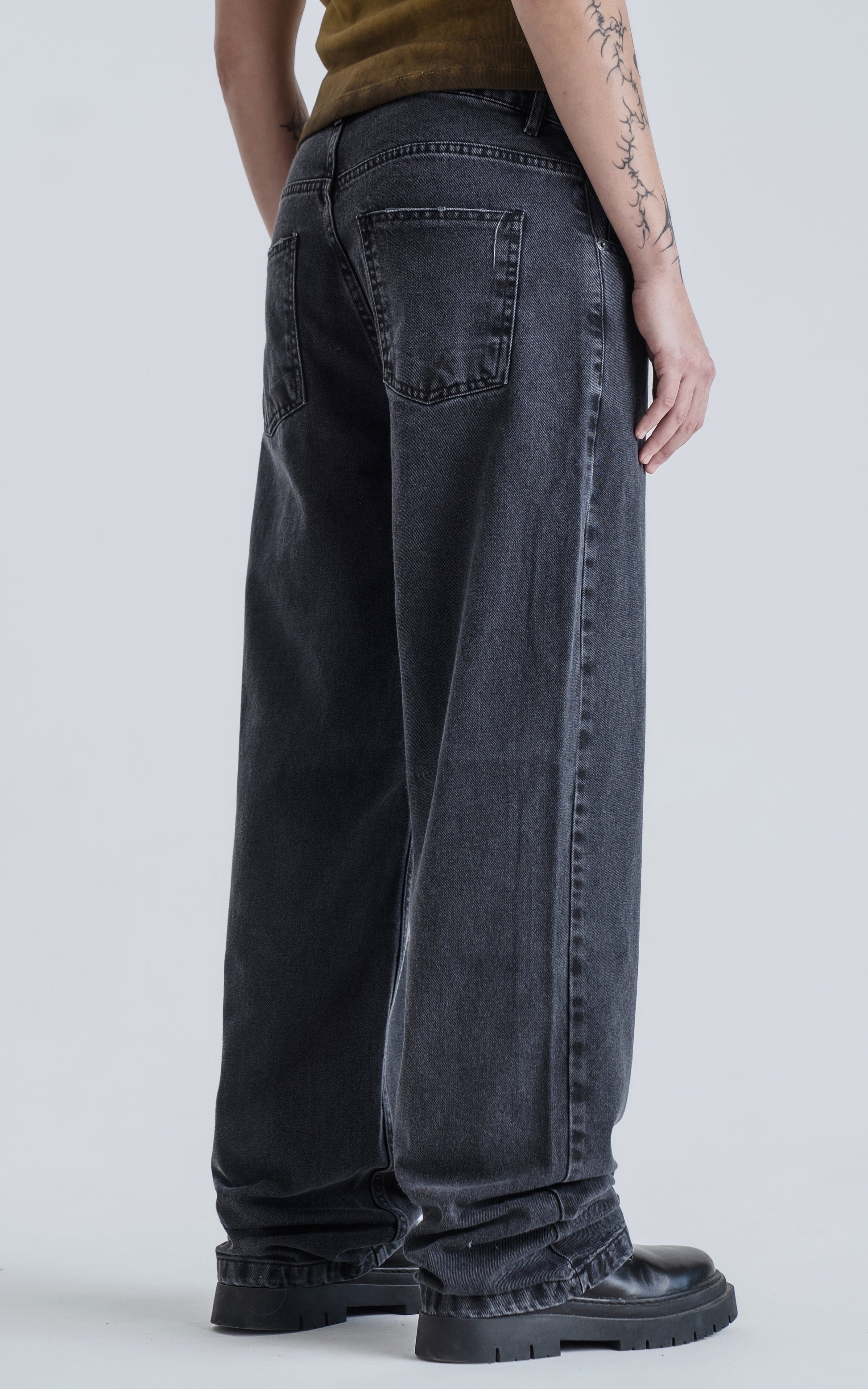 Confeccionado en denim 100% algodón de tejido plano, tiene un lavado clásico que combina con absolutamente todo. Es cómodo, resistente y tiene una caída amplia que te da libertad para moverte sin perder estilo.