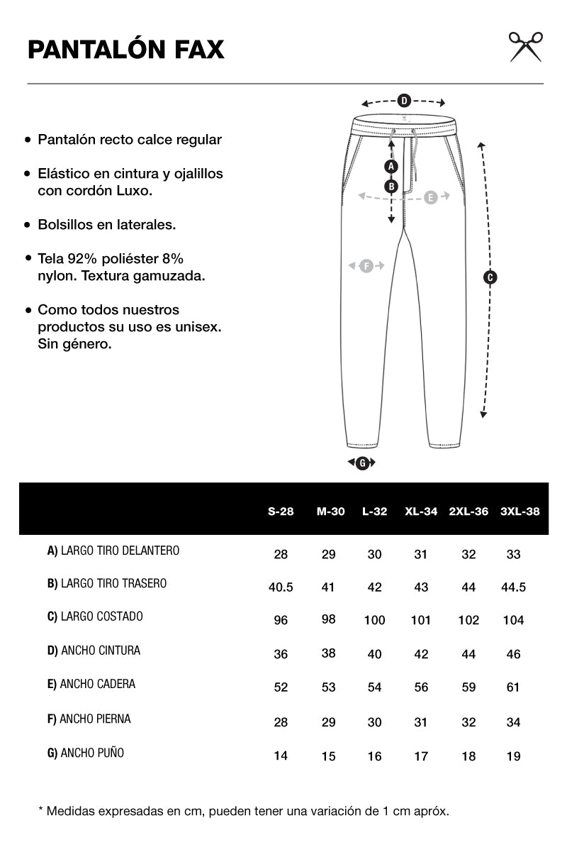 Origen: Como todos nuestros productos, el pantalón Fax fue diseñado por nuestro departamento de producción y confeccionado mediante la utilización de energías renovables en Solar Park, nuestra planta de producción ubicada en La Rioja, Argentina.