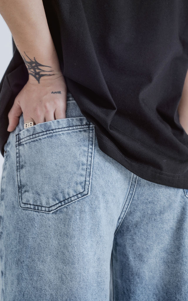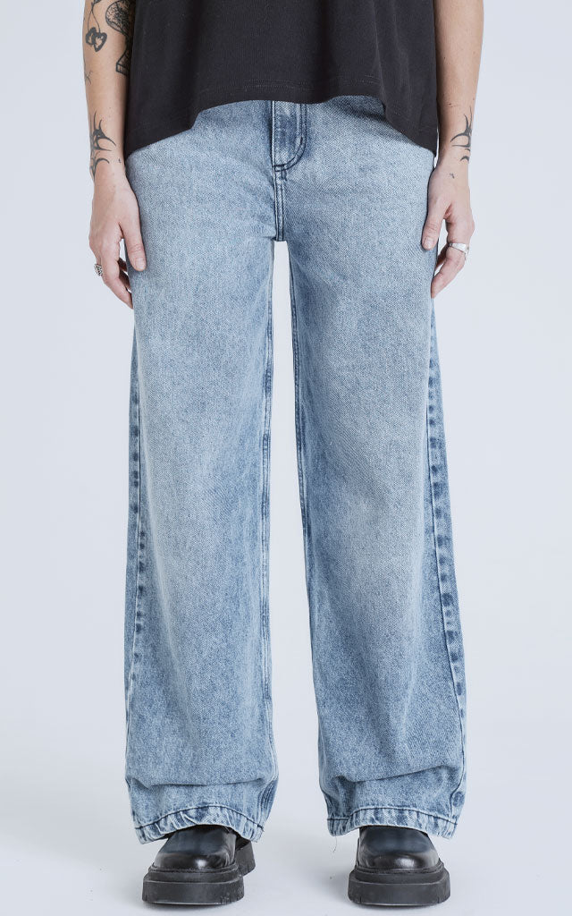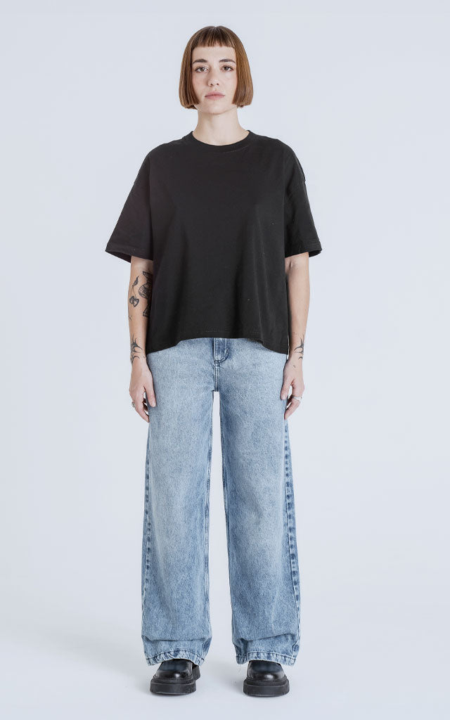Pantalón con 5 bolsillos. Calce wide leg. Realizado en tejido plano, denim 100% algodón con lavado clásico color negro. Origen: Como todos nuestros productos, el pantalón Wide Leg fue diseñado por nuestro departamento de produccion y confeccionado mediante la utilización de energías renovables en Solar Park, nuestra planta de produccion ubicada en La Rioja, Argentina
