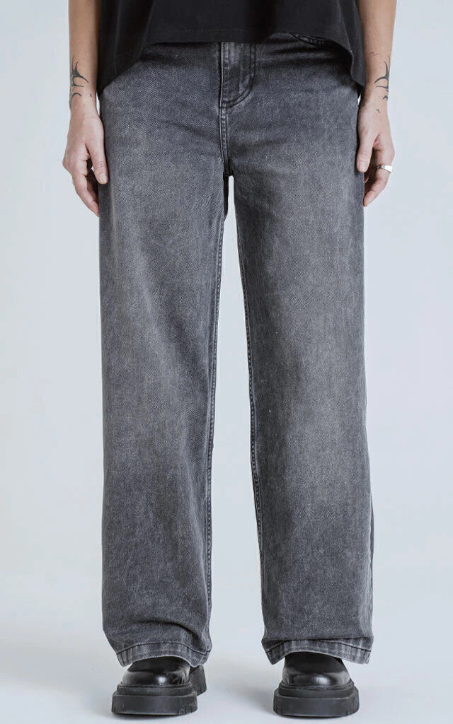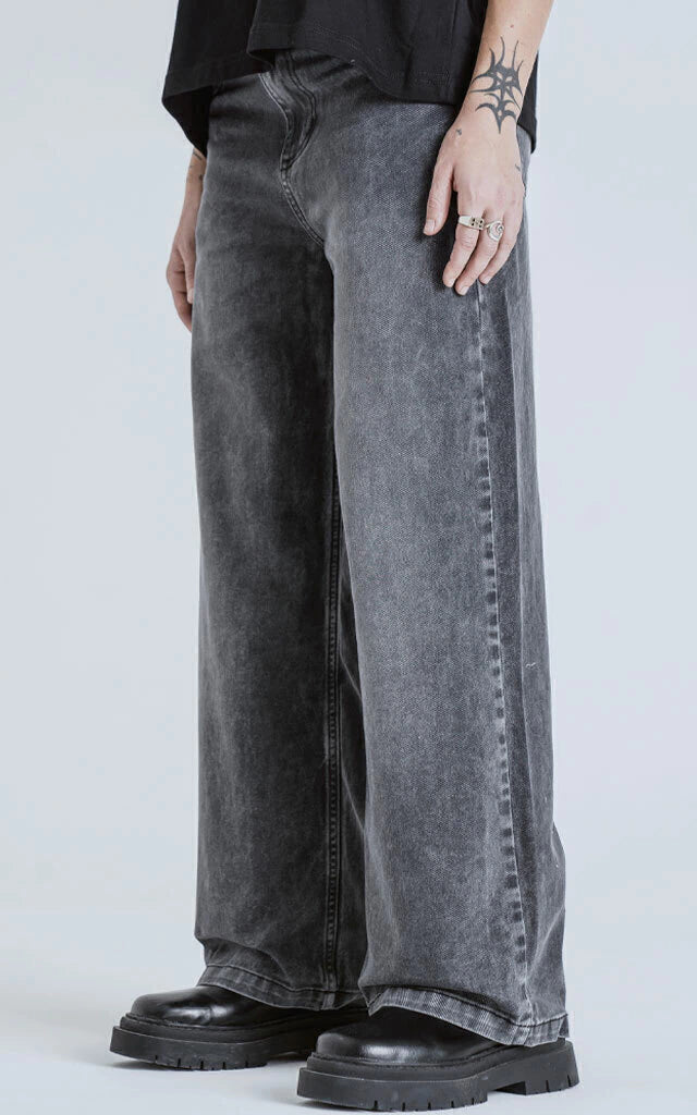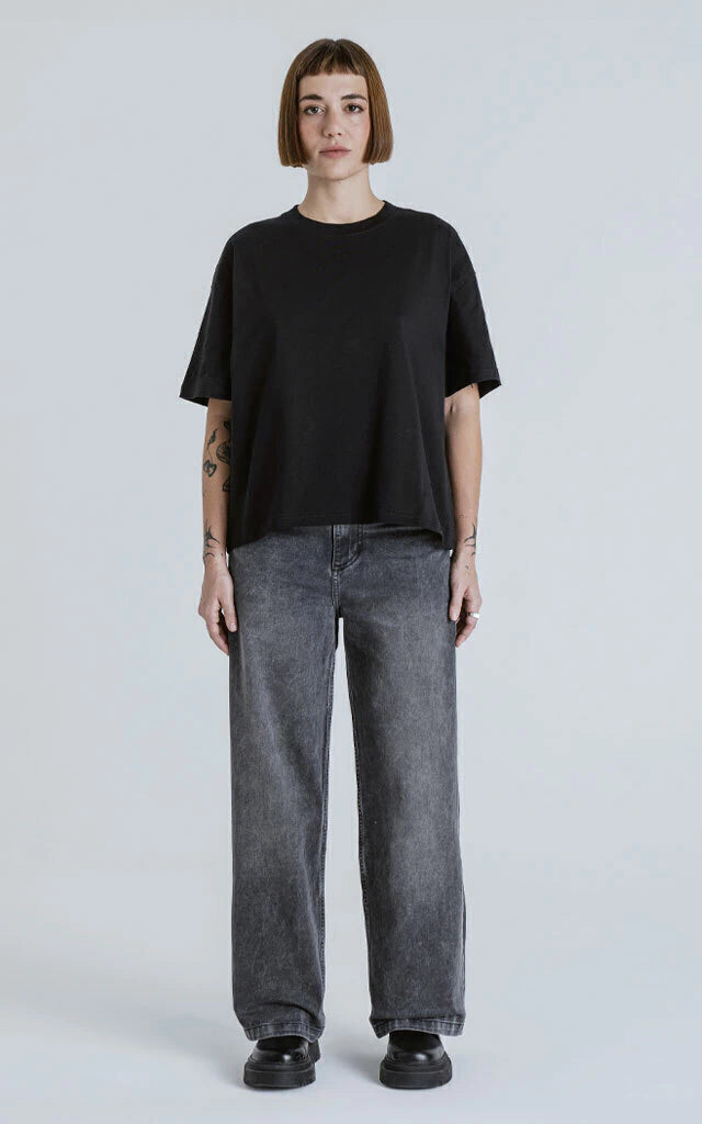 Pantalón con 5 bolsillos. Calce wide leg. Realizado en tejido plano, denim 100% algodón con lavado clásico color negro. Origen: Como todos nuestros productos, el pantalon Wide Leg fue diseñado por nuestro departamento de produccion y confeccionado mediante la utilización de energías renovables en Solar Park, nuestra planta de produccion ubicada en La Rioja, Argentina.