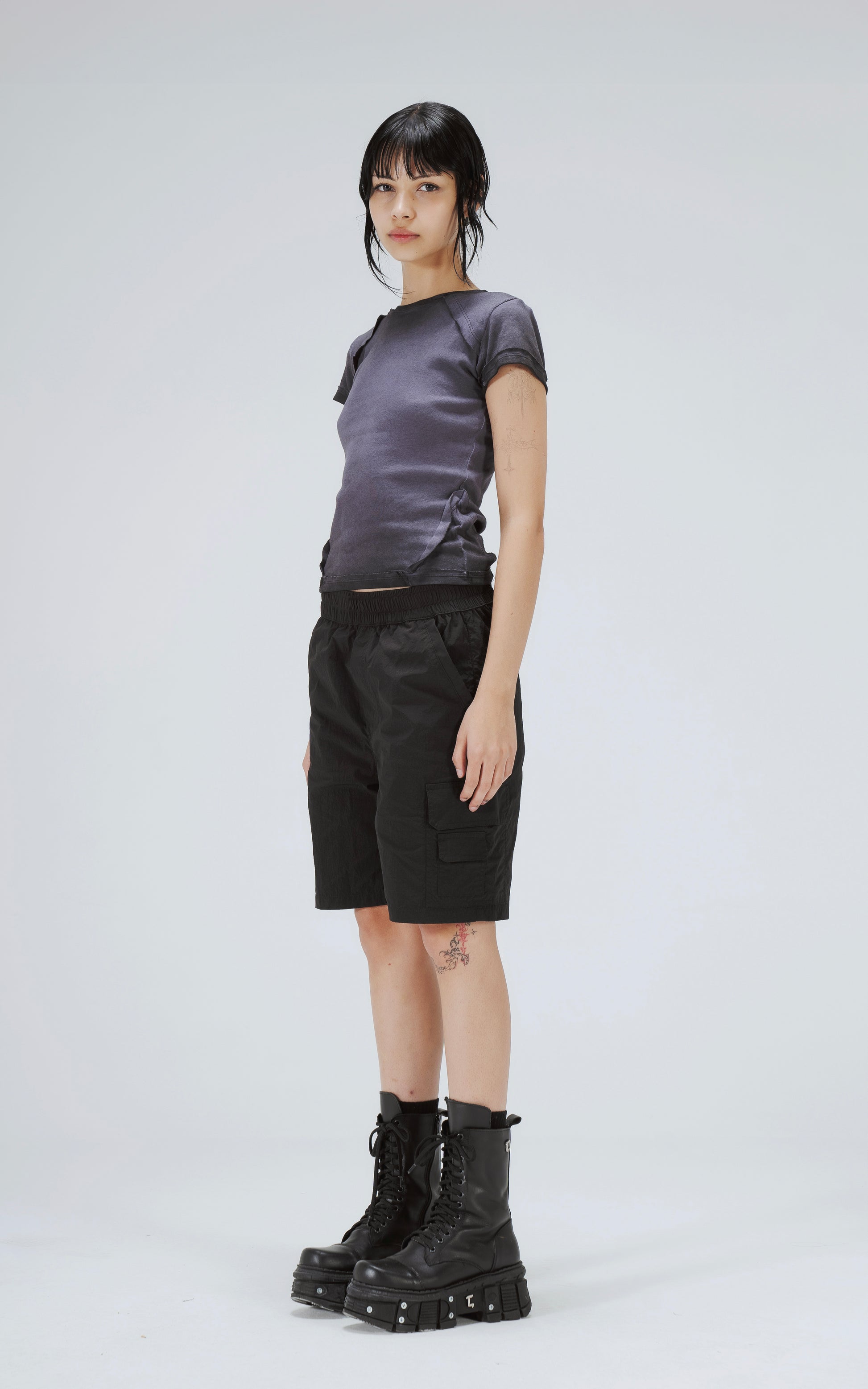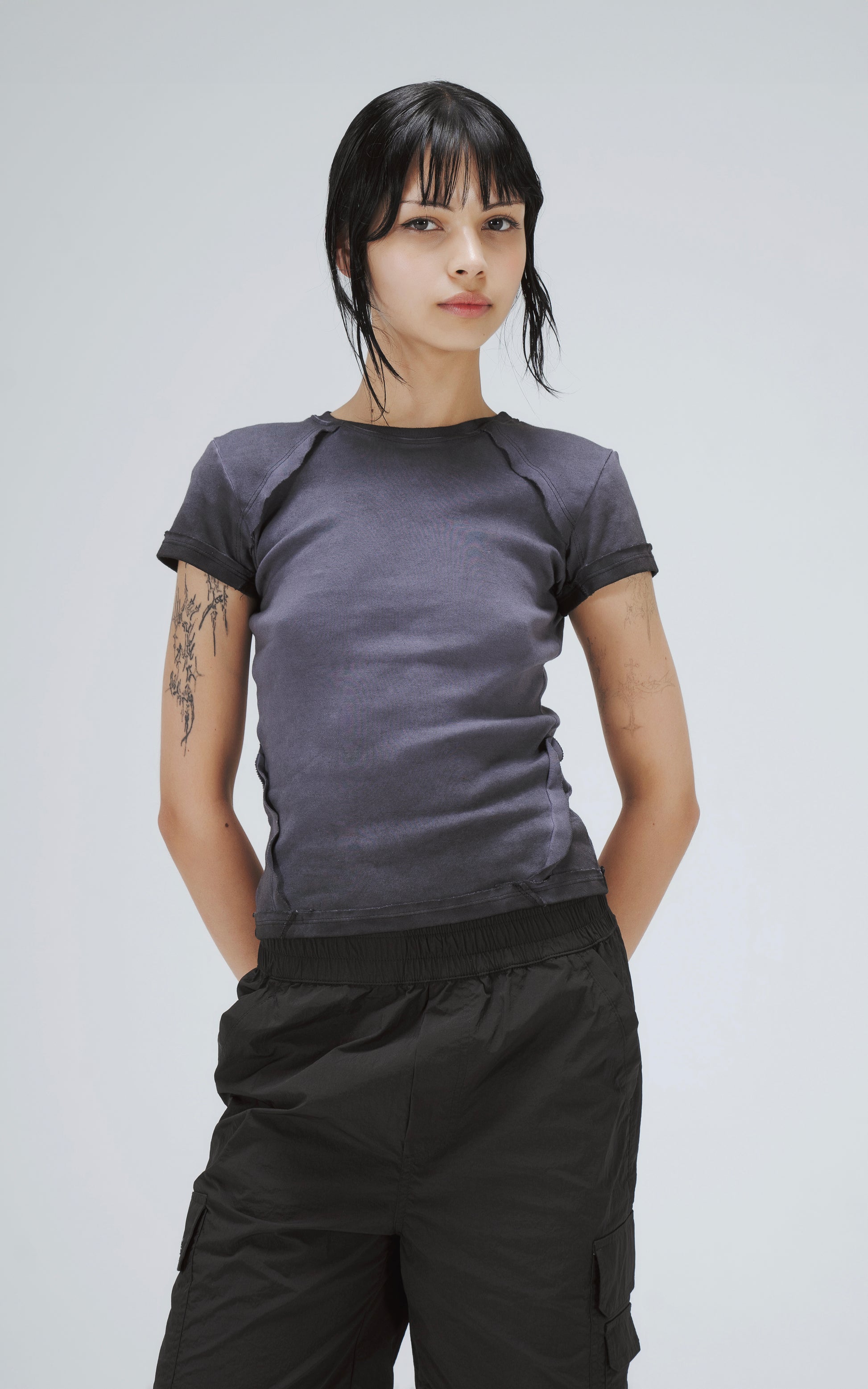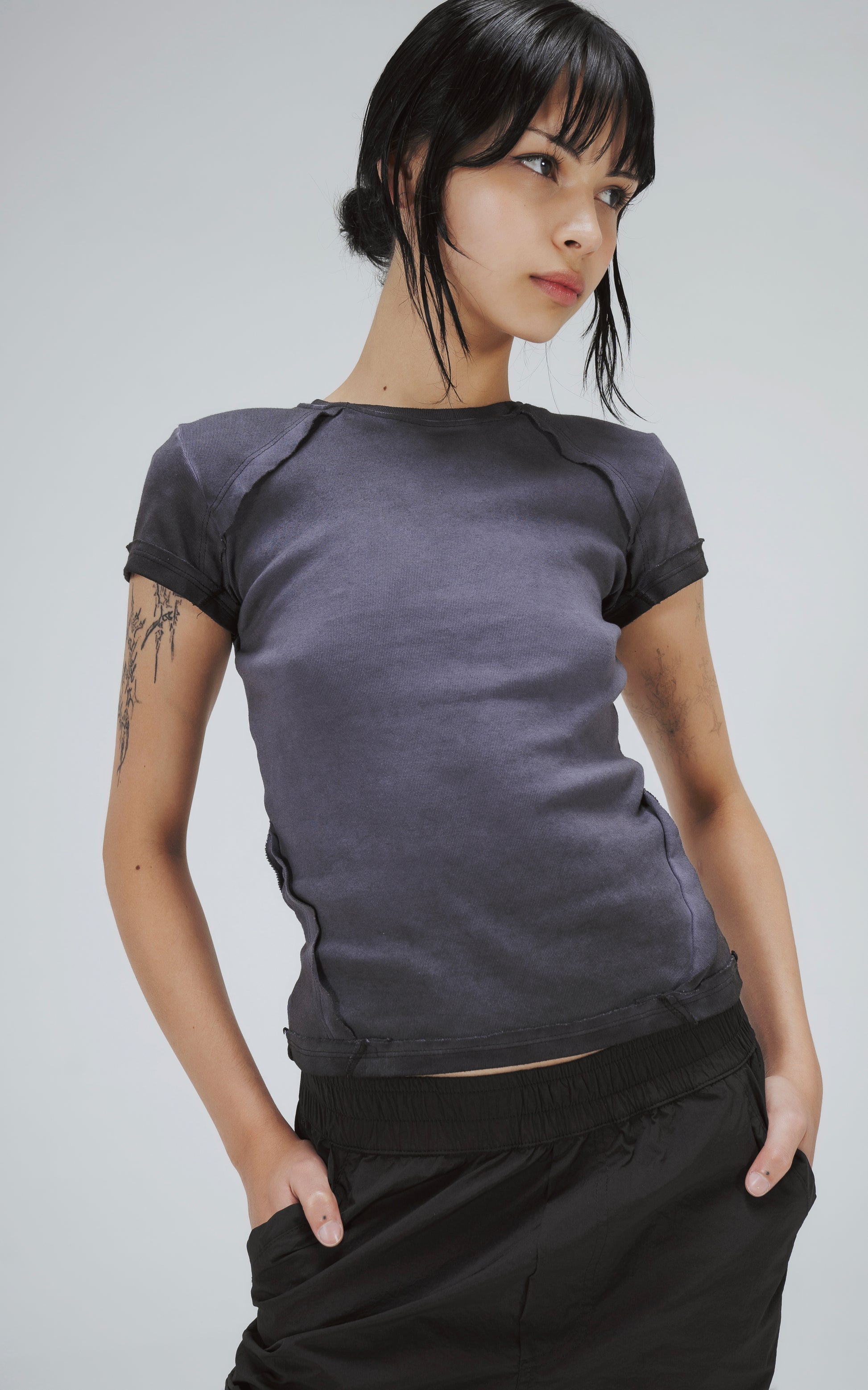 Remera manga corta, de cuello redondo, con moldería de mujer confeccionada en ribb 100% algodón. Es chiquita, al cuerpo; va a la cadera con su largo. Es un básico para usar todo el tiempo, súper cómoda.