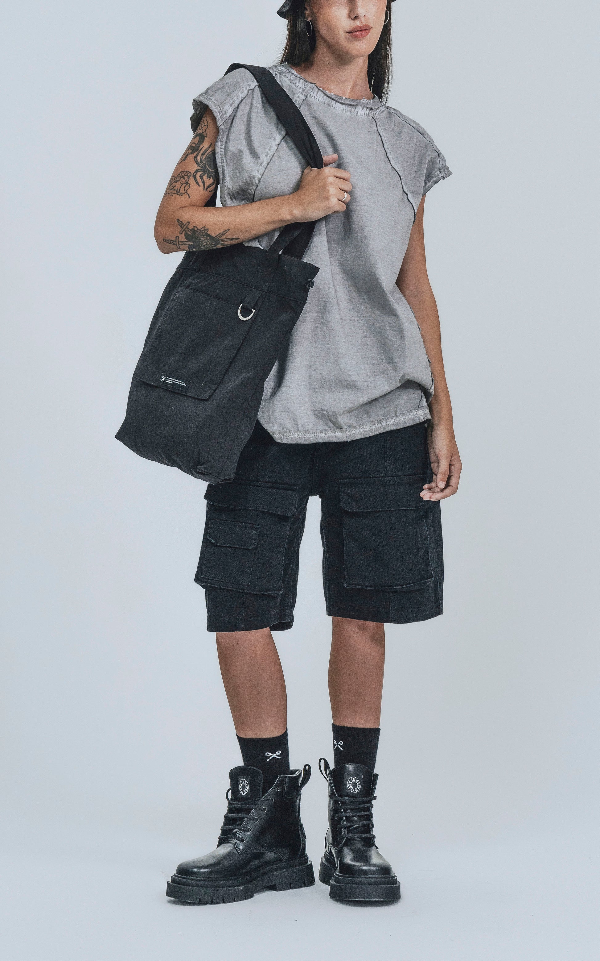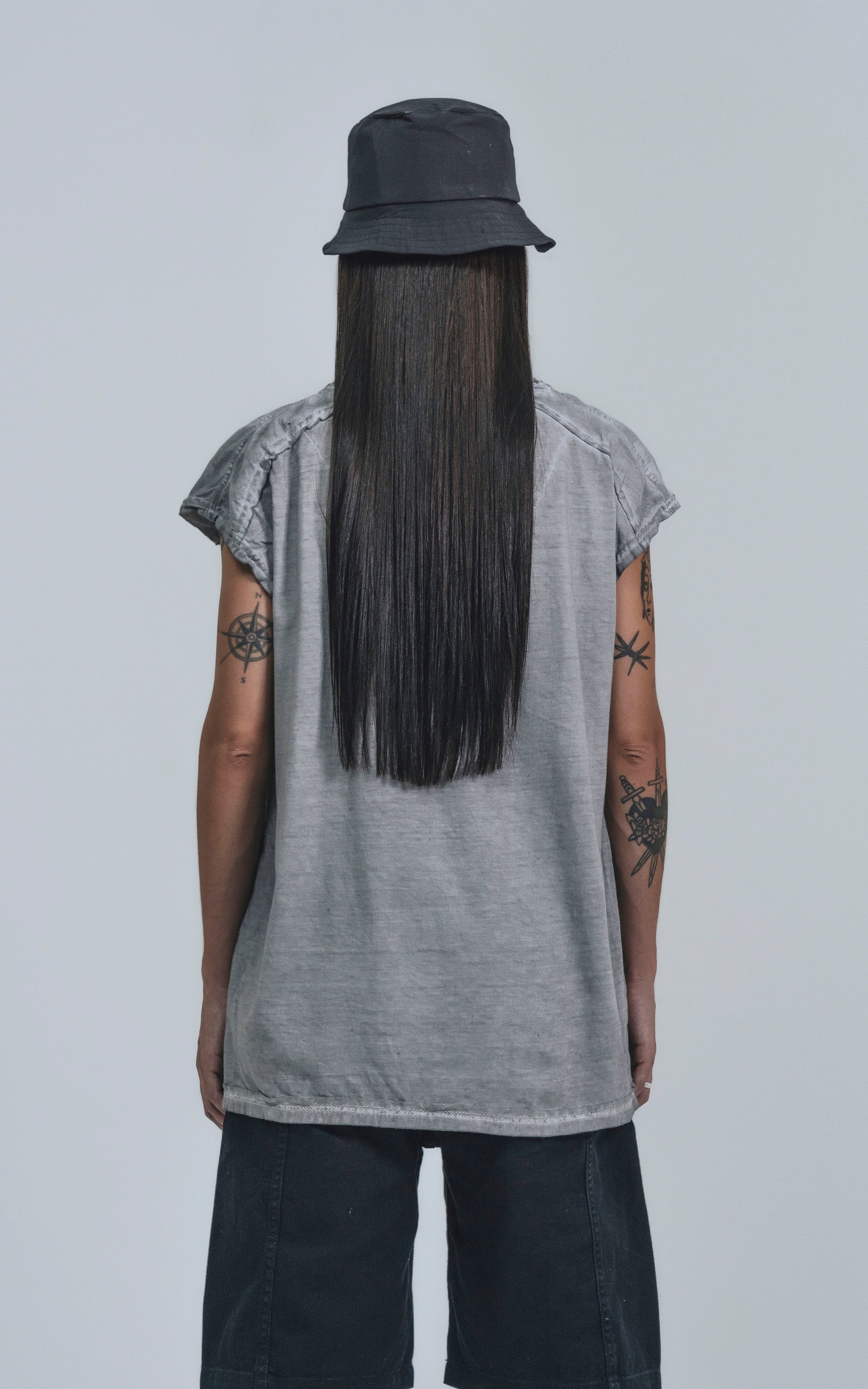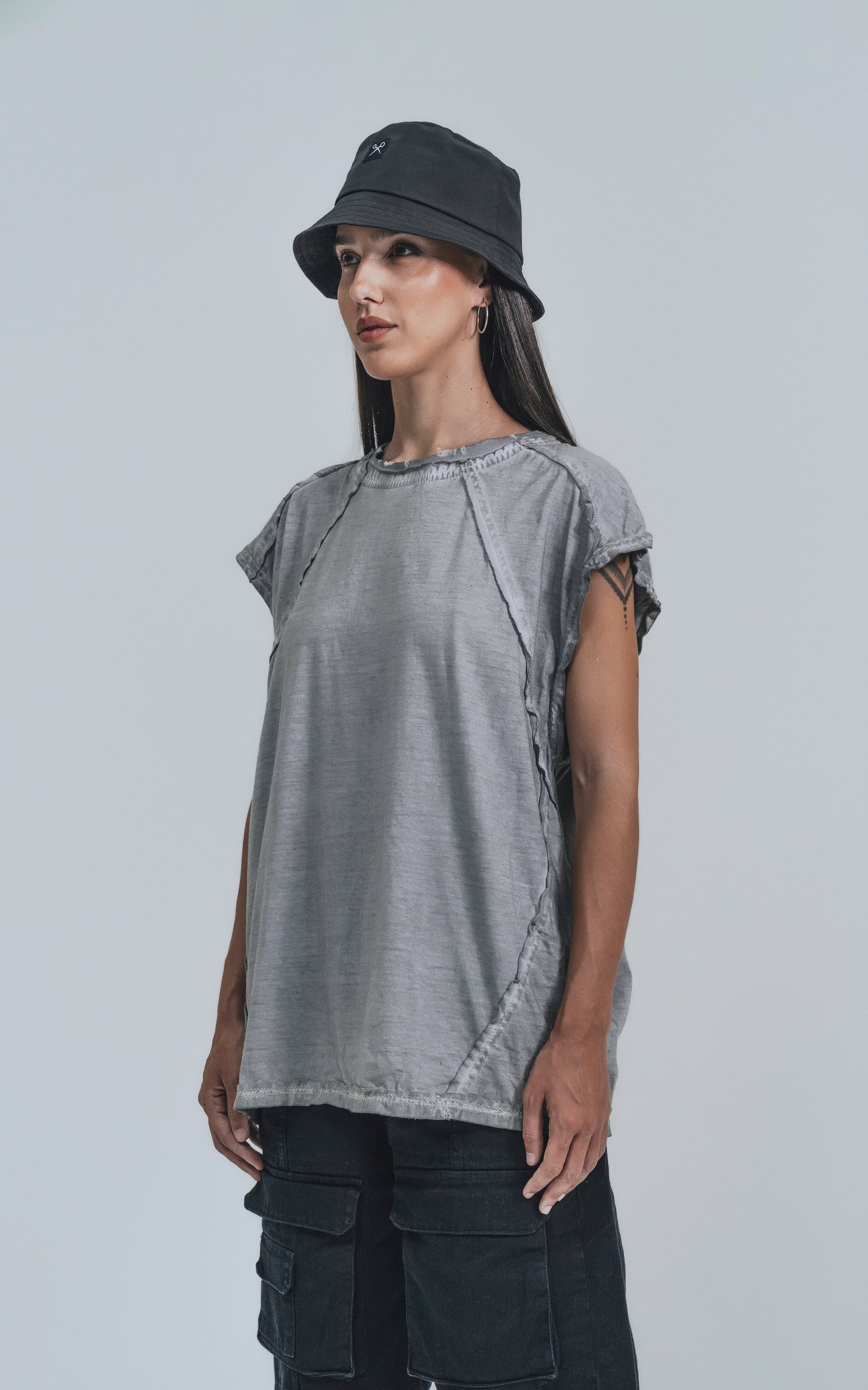 Remera manga corta con recortes en delantero y mangas con proceso efecto gastado confeccionada en textil premium 100% algodón calce oversize.