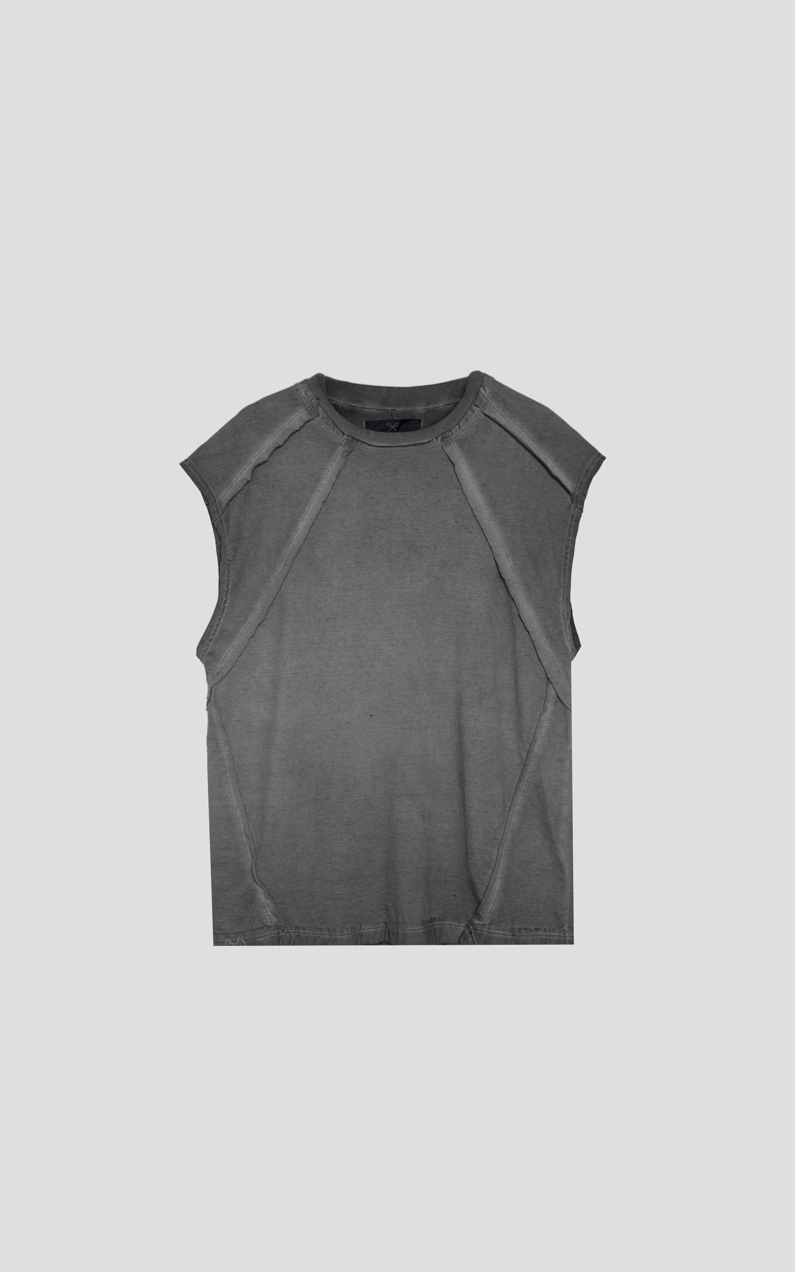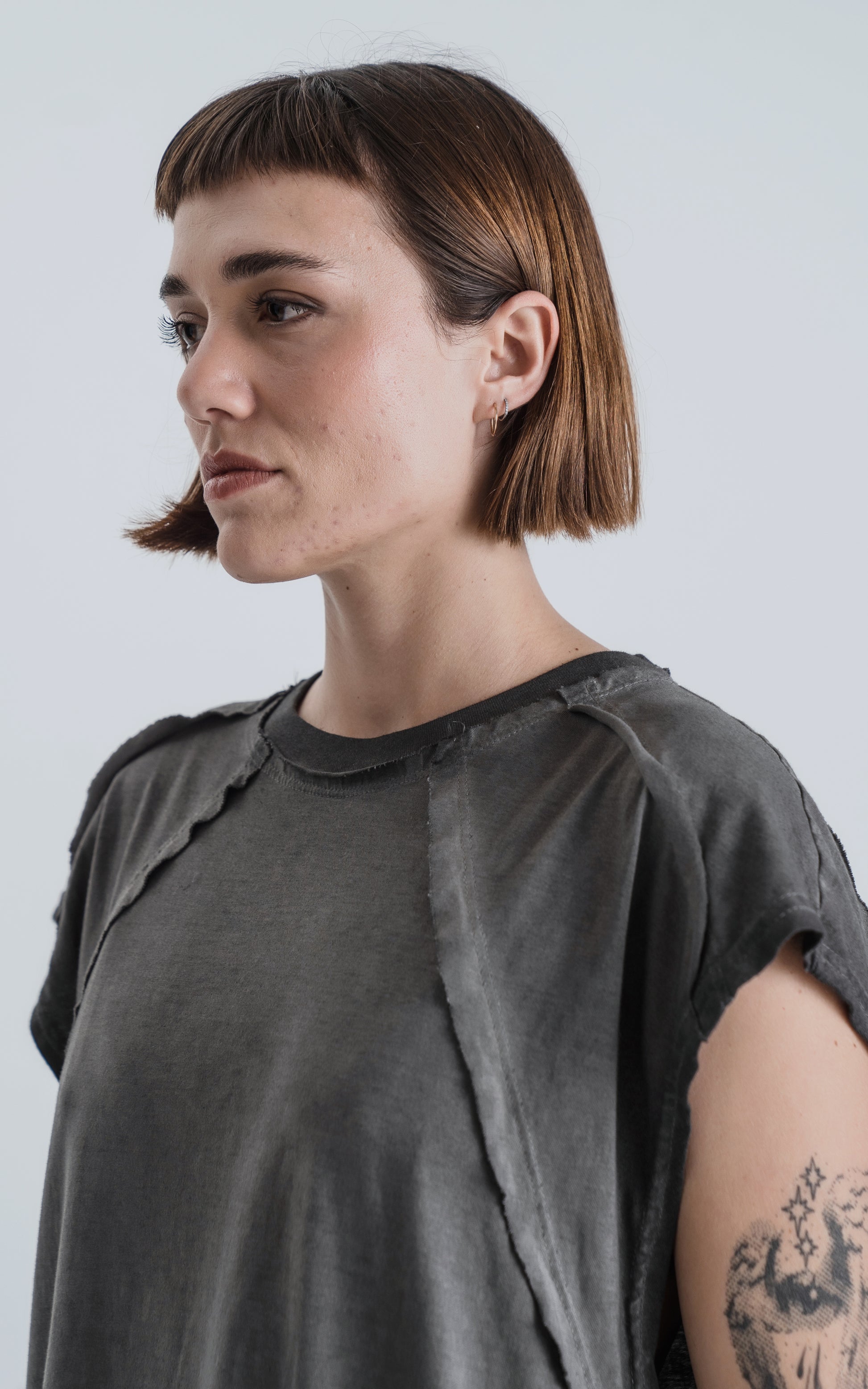 Remera manga corta con recortes en delantero y mangas con proceso efecto gastado confeccionada en textil premium 100% algodón calce oversize.