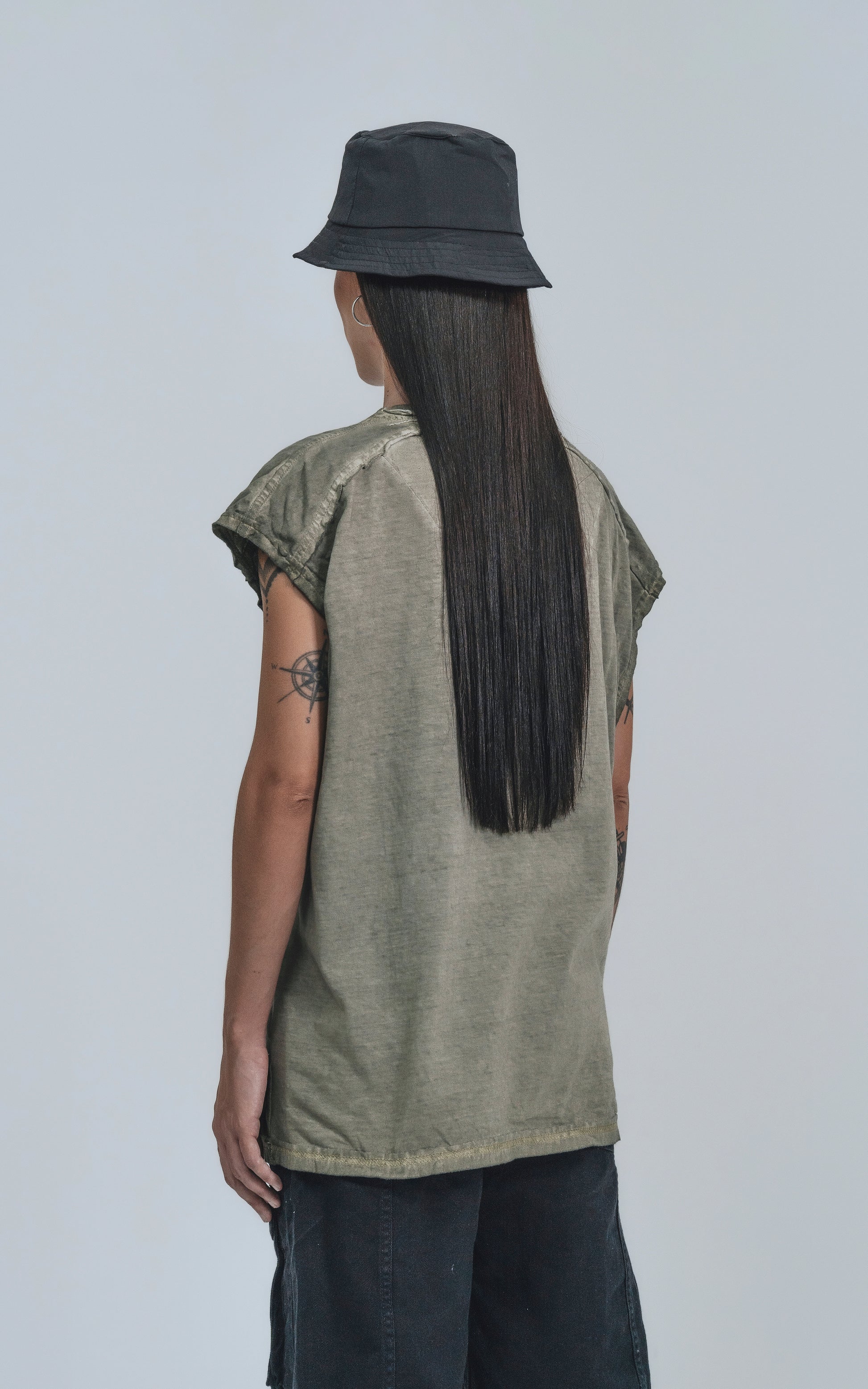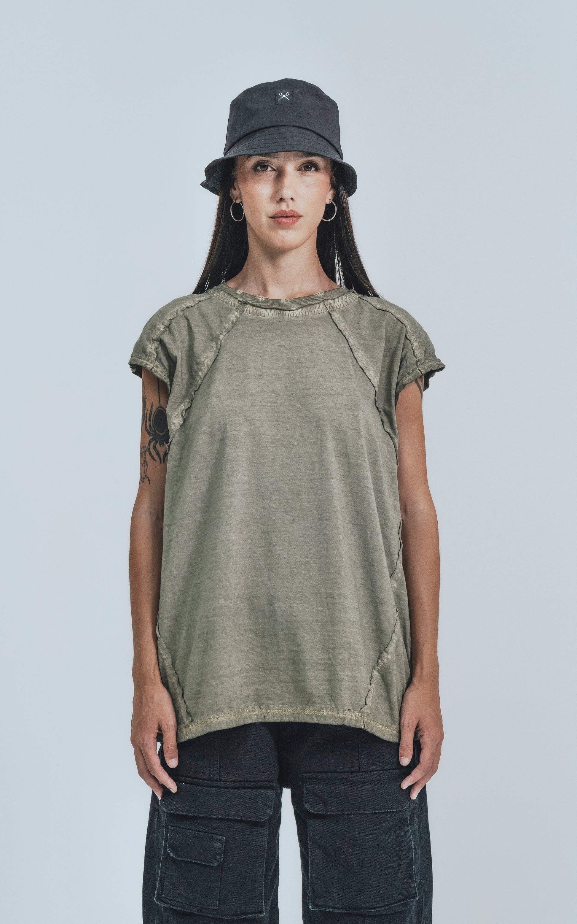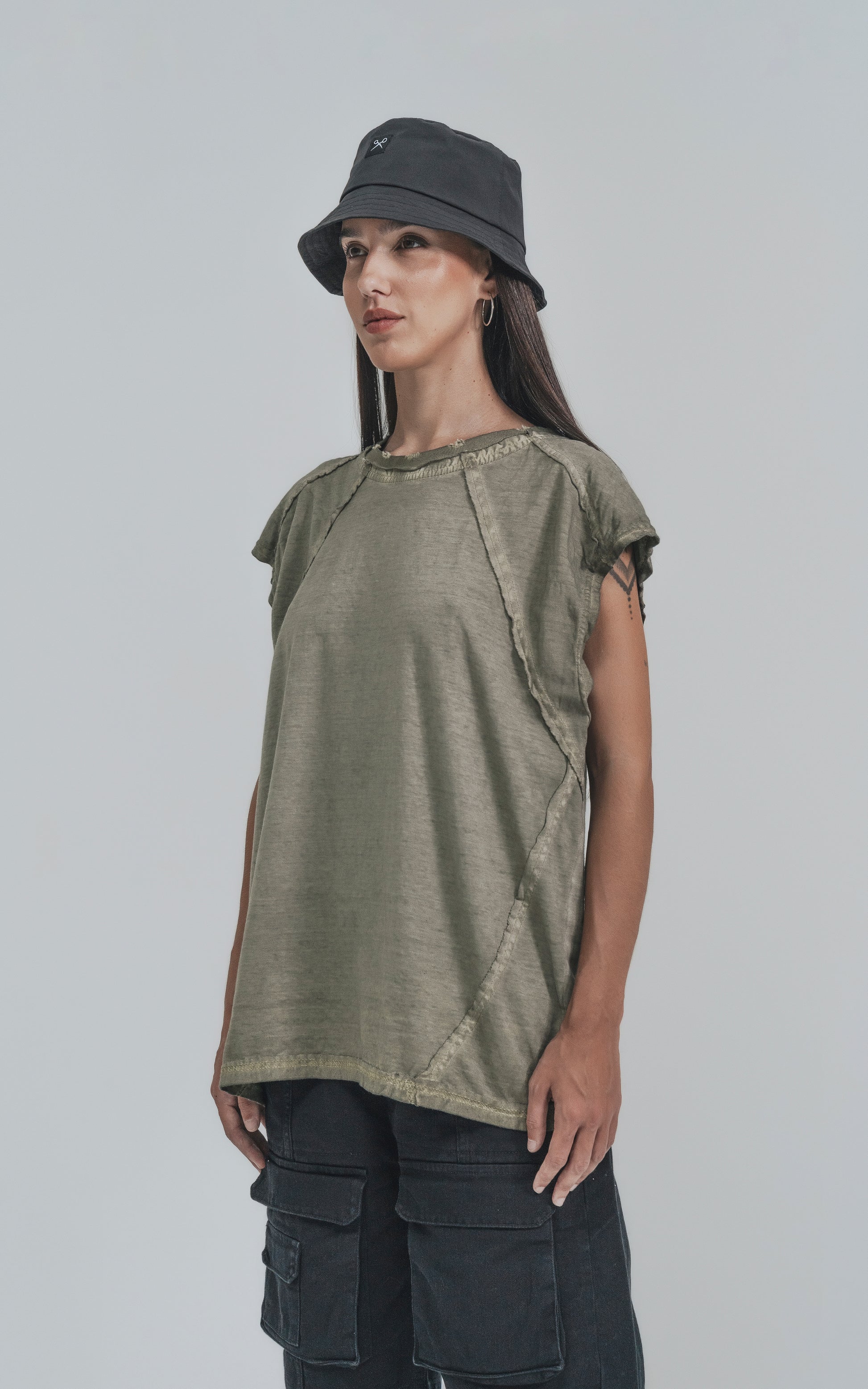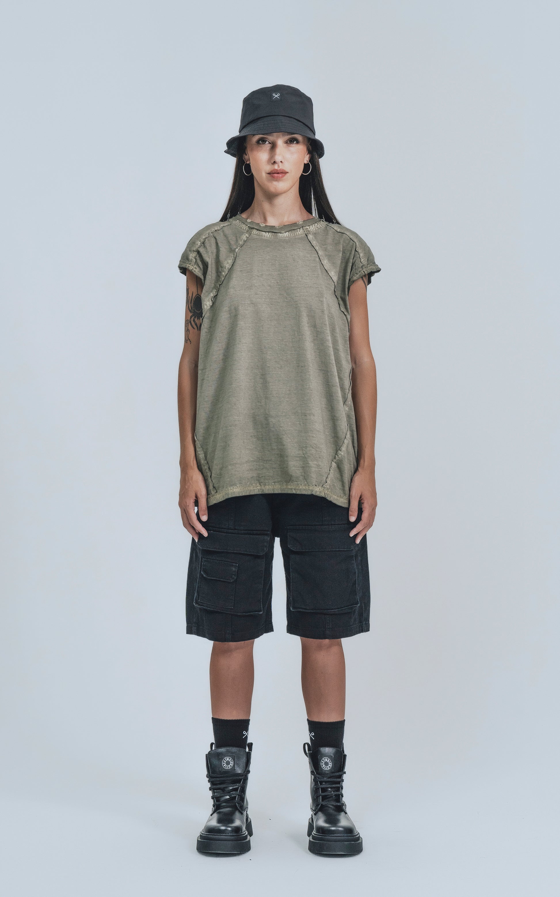 Remera manga corta con recortes en delantero y mangas con proceso efecto gastado confeccionada en textil premium 100% algodón calce oversize.