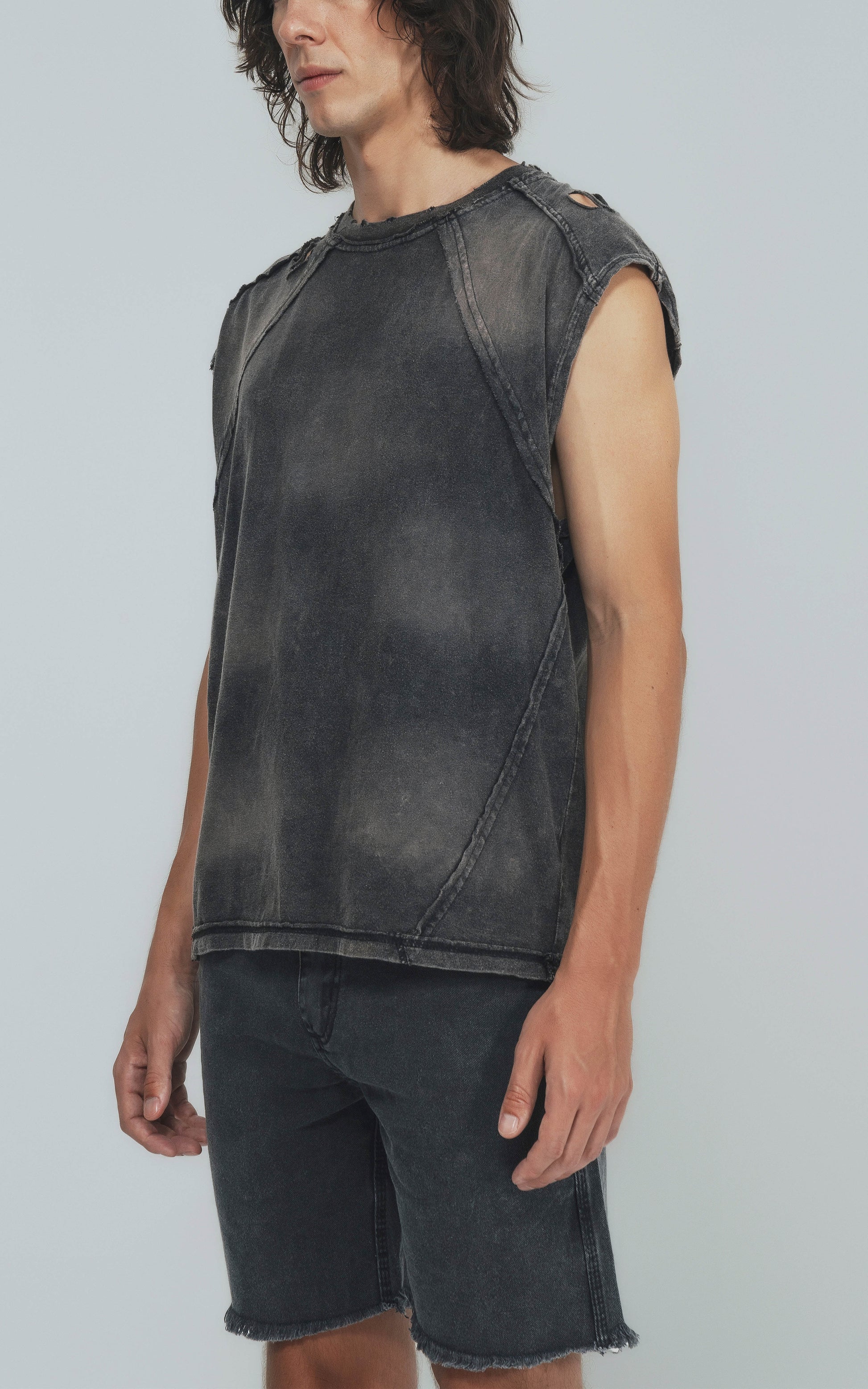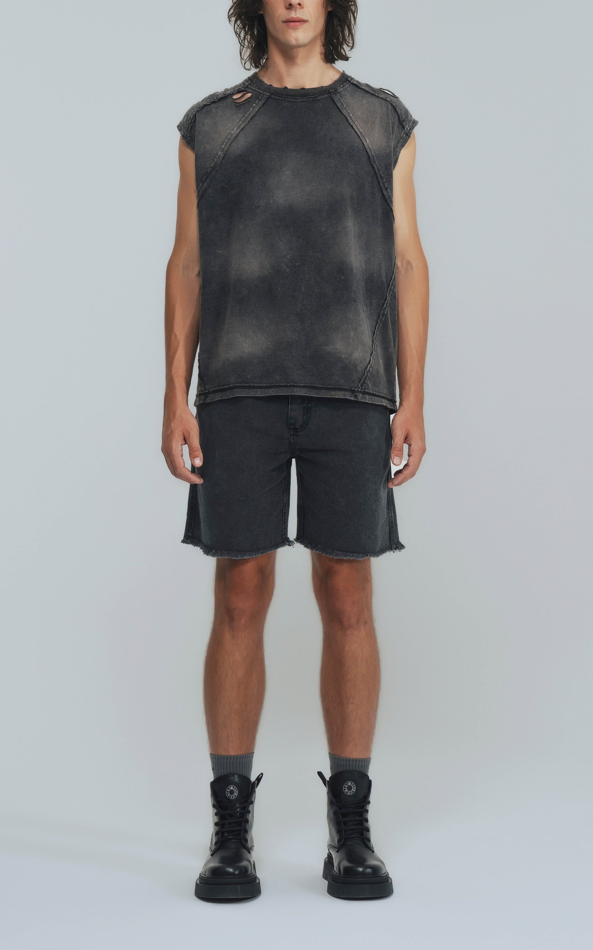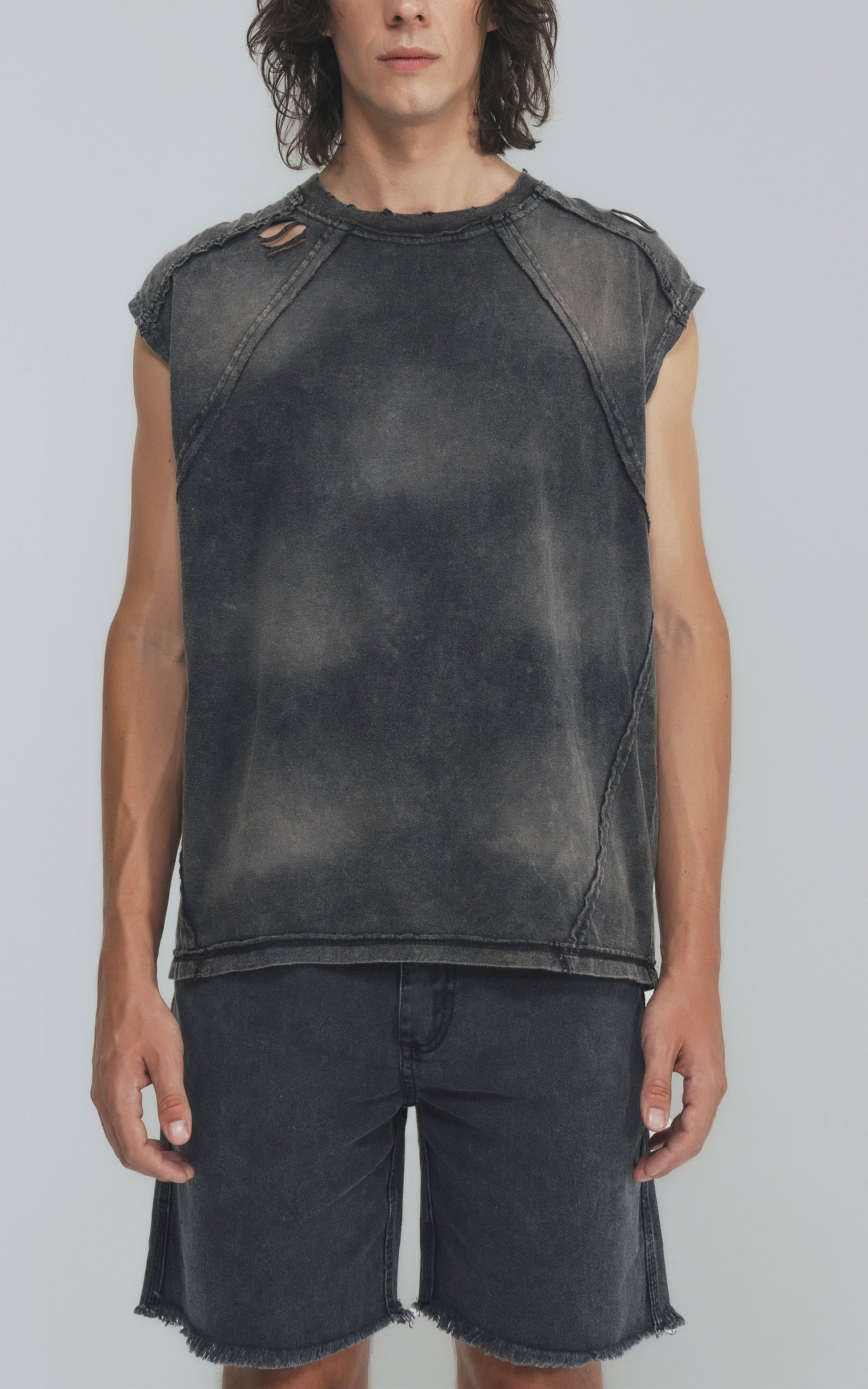 Remera manga corta con recortes en delantero y mangas con proceso efecto gastado confeccionada en textil premium 100% algodón calce oversize.